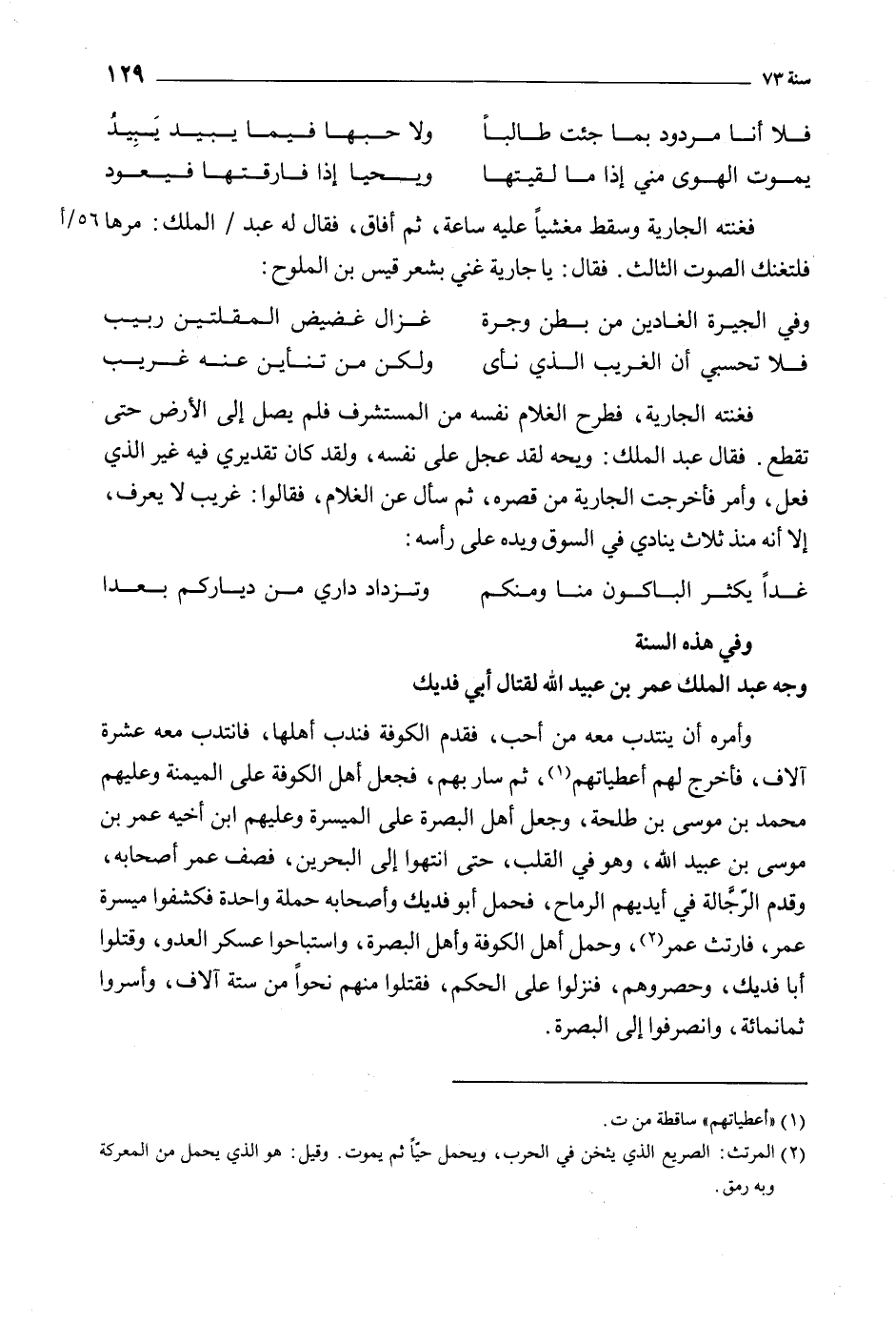فغنته الجارية وسقط مغشيا عليه ساعة، ثم أفاق، فقال له عبد/ الملك: مرها فلتغنك الصوت الثالث. فقال: يا جارية غني بشعر قيس بن الملوح: