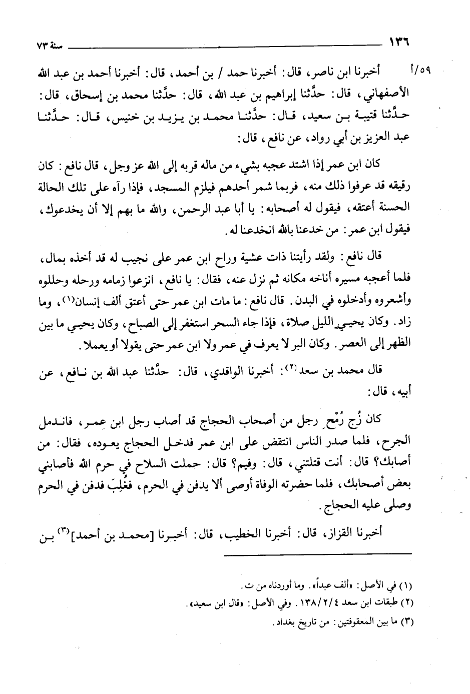 قَالَ نَافِعٌ: وَلَقَدْ رَأَيْتُنَا ذَاتَ عَشِيَّةٍ وَرَاحَ ابْنُ عُمَرَ عَلَى نَجِيبٍ لَهُ قَدْ أَخَذَهُ بِمَالٍ، فَلَمَّا أَعْجَبَهُ مَسِيرُهُ أَنَاخَهُ مَكَانَهُ ثُمَّ نَزَلَ عَنْهُ، فَقَالَ: يَا نَافِعُ، انْزَعُوا زِمَامَهُ وَرَحْلَهُ وَحَلِّلُوهَ وَأَشْعِرُوهَ وَأَدْخِلُوهُ فِي الْبُدْنِ. قَالَ نَافِعٌ: مَا مَاتَ ابْنُ عُمَرَ حَتَّى أَعْتَقَ أَلْفَ إِنْسَانٍ [1] ، وَمَا زَادَ. وَكَانَ يُحْيِي الليل صَلاةً، فَإِذَا جَاءَ السَّحَرُ اسْتَغَفَرَ إِلَى الصَّبَاحِ، وَكَانَ يُحْيِي مَا بَيْنَ الظُّهْرِ إِلَى الْعَصْرِ. وَكَانَ الْبِرّ لا يُعْرَفُ فِي عُمَرَ وَلا ابْنِ عُمَرَ حَتَّى يَقُولا أَوْ يَعْمَلا.