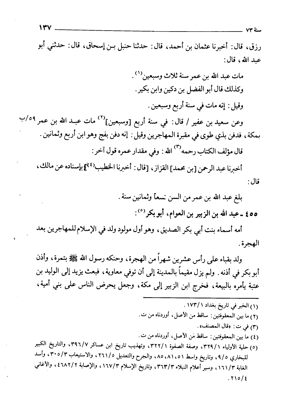 مَاتَ عَبْدُ اللَّهِ بْنُ عُمَرَ سَنَةَ ثَلاثٍ وَسَبْعِينَ [1] .
