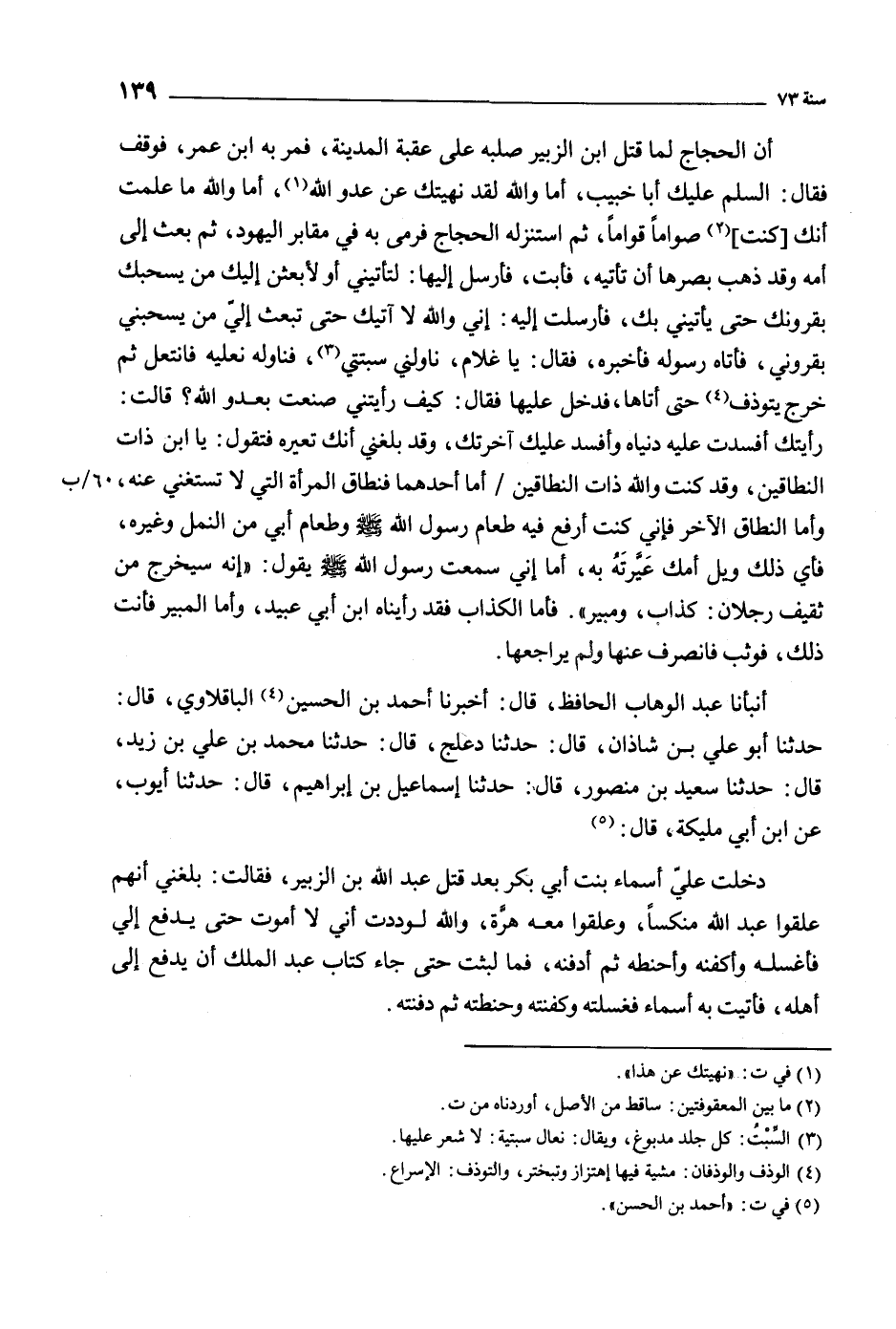 أَنَّ الْحَجَّاجَ لَمَّا قُتِلَ ابْنُ الزُّبَيْرِ صَلَبَهُ عَلَى عَقَبَةِ الْمَدِينَةِ، فَمَرَّ بِهِ ابْنُ عُمَرَ، فوقف فقال: السلم عَلَيْكَ أَبَا خُبَيْبٍ، أَمَا وَاللَّهِ لَقَدْ نَهَيْتُكَ عَنْ عَدُوِّ اللَّهِ [1] ، أَمَا وَاللَّهِ مَا عَلِمْتُ أنك [كُنْتَ] [2] صَوَّامًا قَوَّامًا، ثُمَّ اسْتَنْزَلَهُ الْحَجَّاجُ فَرَمَى بِهِ فِي مَقَابِرِ الْيَهِودِ، ثُمَّ بَعَثَ إِلَى أُمِّهِ وَقَدْ ذَهَبَ بَصَرُهَا أَنْ تَأْتِيَهُ، فَأَبَتْ، فَأَرْسَلَ إِلَيْهَا: لَتَأْتِيَنِّي أَوْ لأَبْعَثَنَّ إِلَيْكِ مَنْ يَسْحَبُكِ بِقُرُونِكِ حَتَّى يَأْتِيَنِي بِكِ، فَأَرْسَلَتْ إِلَيْهِ: إِنِّي وَاللَّهِ لا آتِيكَ حَتَّى تَبْعَثَ إِلَيَّ من يسحبني بقروني، فأتاه رسوله فأخبره، فقال: يا غلام، ناولني سبتيتي [3] ، فَنَاوَلَهُ نَعْلَيْهِ فَانْتَعَلَ ثُمَّ خَرَجَ يَتَوَذَّفُ [4] حَتَّى أَتَاهَا، فَدَخَلَ عَلَيْهَا فَقَالَ: كَيْفَ رَأَيْتِنِي صَنَعْتُ بِعَدُوِّ اللَّهِ؟ قَالَتْ: