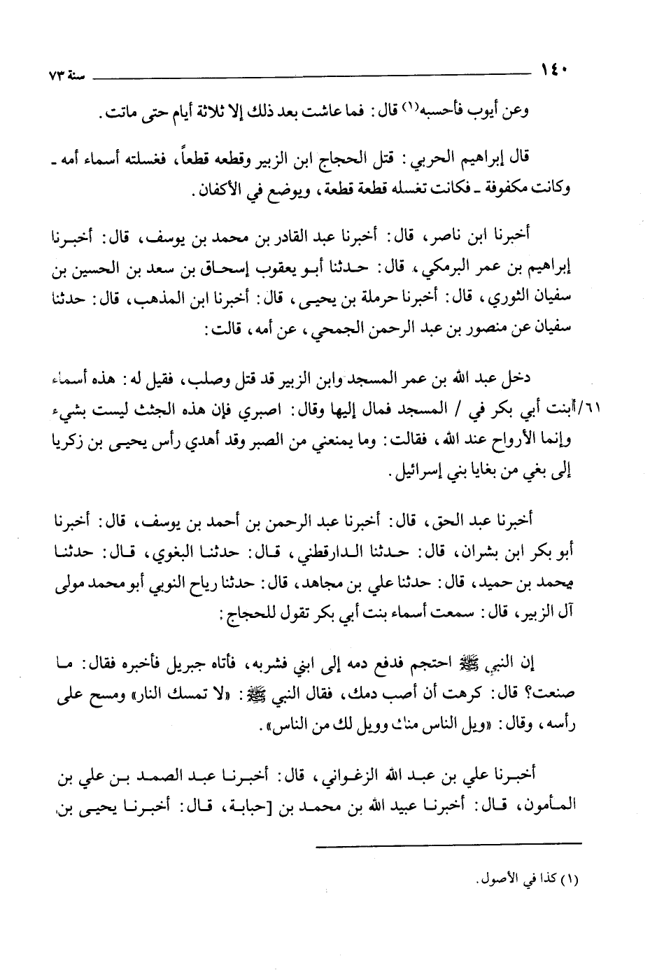 دَخَلَ عَبْدُ اللَّهِ بْنُ عُمَرَ الْمَسْجِدَ وَابْنُ الزُّبَيْرِ قَدْ قُتِلَ وَصُلِبَ، فَقِيلَ لَهُ: هَذِهِ أَسْمَاءُ بِنْتُ أَبِي بَكْرٍ فِي/ الْمَسْجِدِ فَمَالَ إِلَيْهَا وَقَالَ: اصْبِرِي فَإِنَّ هَذِهِ الْجُثَثَ لَيْسَتْ بِشَيْءٍ وَإِنَّمَا الأَرْوَاحُ عِنْدَ اللَّهِ، فَقَالَتْ: وَمَا يَمْنَعُنِي مِنَ الصَّبْرِ وَقَدْ أُهْدِيَ رَأْسُ يَحْيَى بْنِ زَكَرِيَّا إِلَى بَغِيٍّ مِنْ بَغَايَا بَنِي إِسْرَائِيلَ.