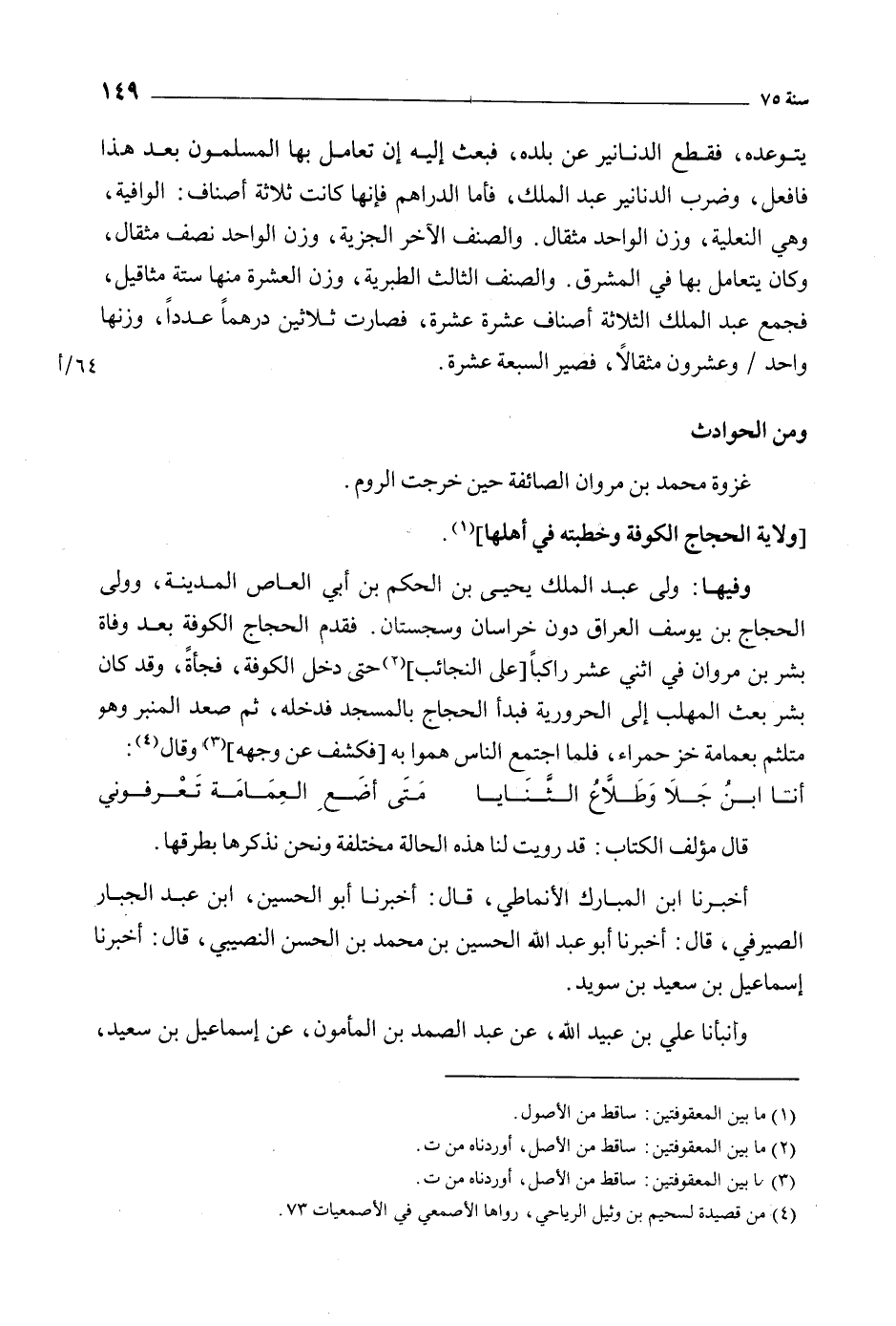 وفيها: ولى عبد الملك يحيى بن الحكم بن أبي العاص المدينة، وولى الحجاج بن يوسف العراق دون خراسان وسجستان. فقدم الحجاج الكوفة بعد وفاة بشر بن مروان في اثني عشر راكبا [على النجائب] [2] حتى دخل الكوفة، فجأة، وقد كان بشر بعث المهلب إلى الحرورية فبدأ الحجاج بالمسجد فدخله، ثم صعد المنبر وهو متلثم بعمامة خز حمراء، فلما اجتمع الناس هموا به [فكشف عن وجهه] [3] وقال [4] :