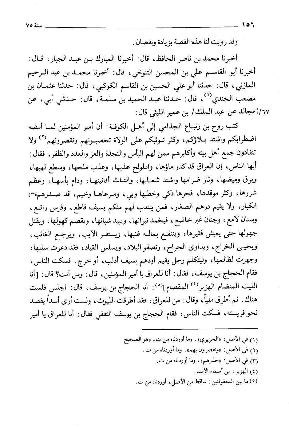 أيها الناس، إن العراق قد كدر ماؤها، واملولح عذبها، وعذب ملحها، وسطع لهبها، وبرق وميضها، وثار ضرامها واشتد شعابها، والتاث أفانينها، ودام بأسها، وعظم شررها، وكثر موقدها، فحرها ذكي وخطبها وبي، ومرعاها وخيم، قد صدرهم [3] الكبار، ولا يقيم درهم الصغار، فمن ينتدب لهم منكم بسيف قاطع، وفرس راتع، وسنان لامع، وجنان غير خاضع، فيخمد نيرانها، ويبيد شبانها، ويقصم كهولها، ويقتل جهولها حتى يعيش فقيرها، وينتفع بماله غنيها، ويستقر الآئب، ويرجع الغائب، ويحيى الخراج، ويداوى الجراح، وتصفو البلاد، ويسلس القياد، فقد دعوت سلبها، وجهرت لظالمها، وليتكلم رجل يقيم أودهم بسيف أدلب، أو خرج. فسكت الناس، فقام الحجاج بن يوسف، فقال: أنا للعراق يا أمير المؤمنين، قال: ومن أنت؟ قال: [أنا الليث المنضام الهزبر [4] المقصام] [5] : أنا الحجاج بن يوسف، قال: اجلس فلست هناك. ثم أطرق مليا، وقال: من للعراق، فقد أطرقت الليوث، ولست أرى أسدا يقصد نحو فريسته، فسكت الناس، فقام الحجاج بن يوسف الثقفي فقال: أنا للعراق يا أمير