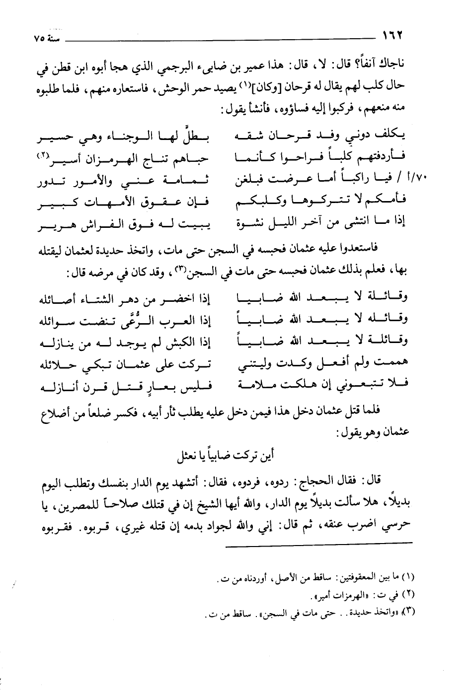 أين تركت ضابئا يا نعثل قال: فقال الحجاج: ردوه، فردوه، فقال: أتشهد يوم الدار بنفسك وتطلب اليوم بديلا، هلا سألت بديلا يوم الدار، والله أيها الشيخ إن في قتلك صلاحا للمصرين، يا حرسي اضرب عنقه، ثم قال: إني والله لجواد بدمه إن قتله غيري، قربوه. فقربوه