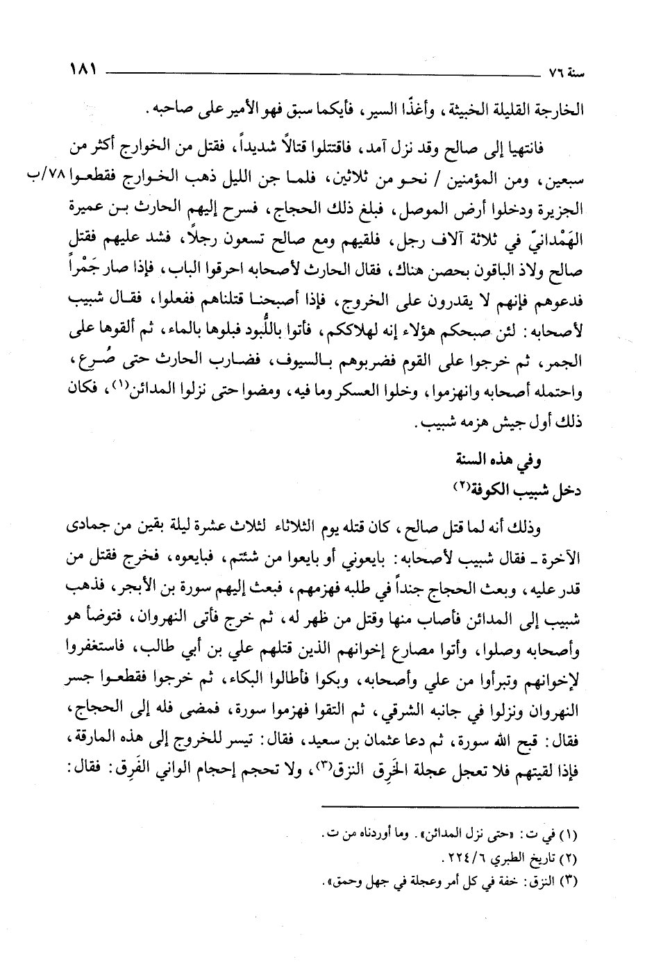 وذلك أنه لما قتل صالح، كان قتله يوم الثلاثاء لثلاث عشرة ليلة بقين من جمادى الآخرة- فقال شبيب لأصحابه: بايعوني أو بايعوا من شئتم، فبايعوه، فخرج فقتل من قدر عليه، وبعث الحجاج جندا في طلبه فهزمهم، فبعث إليهم سورة بن الأبجر، فذهب شبيب إلى المدائن فأصاب منها وقتل من ظهر له، ثم خرج فأتى النهروان، فتوضأ هو وأصحابه وصلوا، وأتوا مصارع إخوانهم الذين قتلهم علي بن أبي طالب، فاستغفروا لإخوانهم وتبرءوا من على وأصحابه، وبكوا فأطالوا البكاء، ثم خرجوا فقطعوا جسر النهروان ونزلوا في جانبه الشرقي، ثم التقوا فهزموا سورة، فمضى فله إلى الحجاج، فقال: قبح الله سورة، ثم دعا عثمان بن سعيد، فقال: تيسر للخروج إلى هذه المارقة، فإذا لقيتهم فلا تعجل عجلة الخرق النزق [3] ، ولا تحجم إحجام الواني الفرق: فقال:
