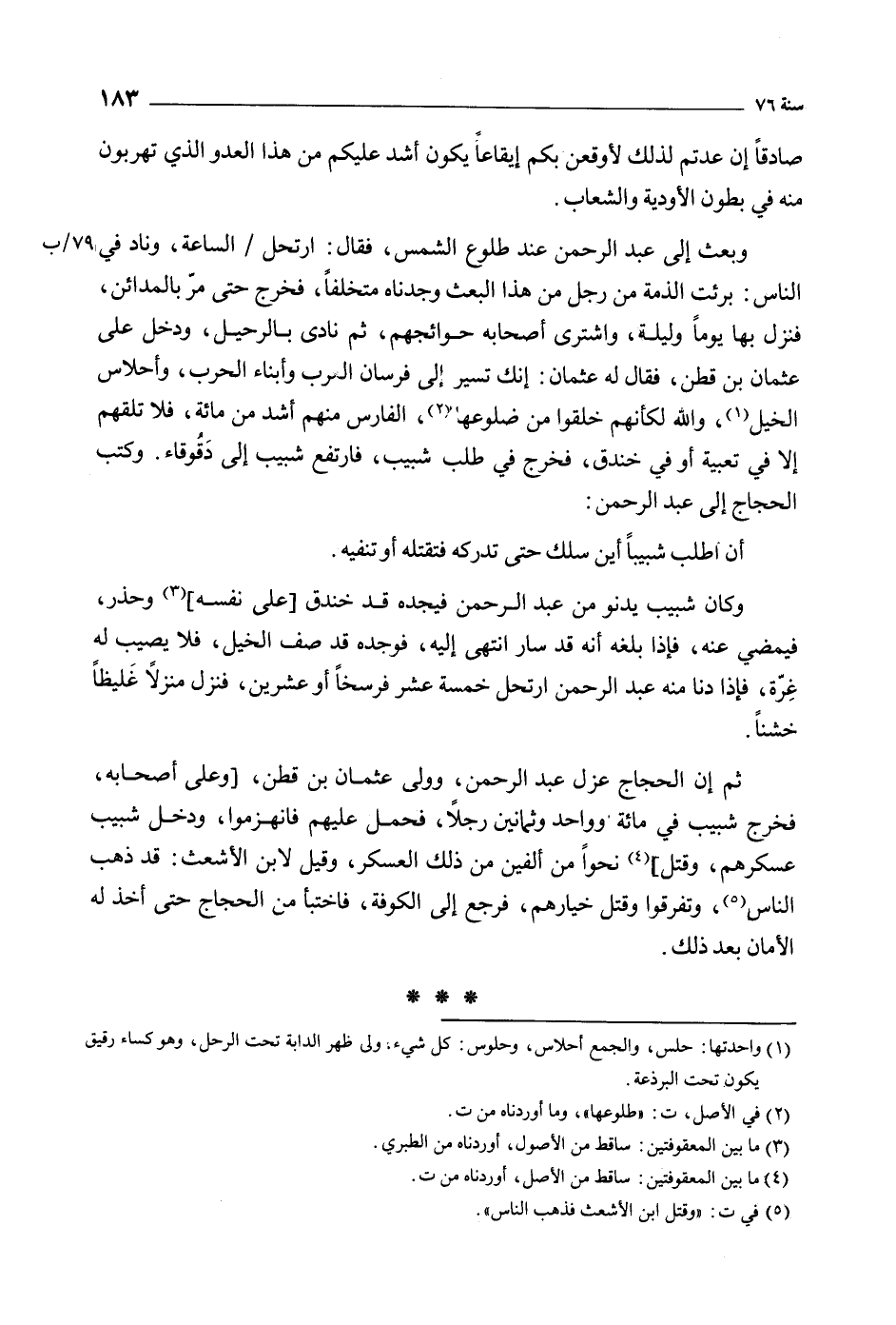 وبعث إلى عبد الرحمن عند طلوع الشمس، فقال: ارتحل/ الساعة، وناد في الناس: برئت الذمة من رجل من هذا البعث وجدناه متخلفا، فخرج حتى مر بالمدائن، فنزل بها يوما وليلة، واشترى أصحابه حوائجهم، ثم نادى بالرحيل، ودخل على عثمان بن قطن، فقال له عثمان: إنك تسير إلى فرسان العرب وأبناء الحرب، وأحلاس الخيل [1] ، والله لكأنهم خلقوا من ضلوعها [2] ، الفارس منهم أشد من مائة، فلا تلقهم إلا في تعبية أو في خندق، فخرج في طلب شبيب، فارتفع شبيب إلى دقوقاء. وكتب الحجاج إلى عبد الرحمن: