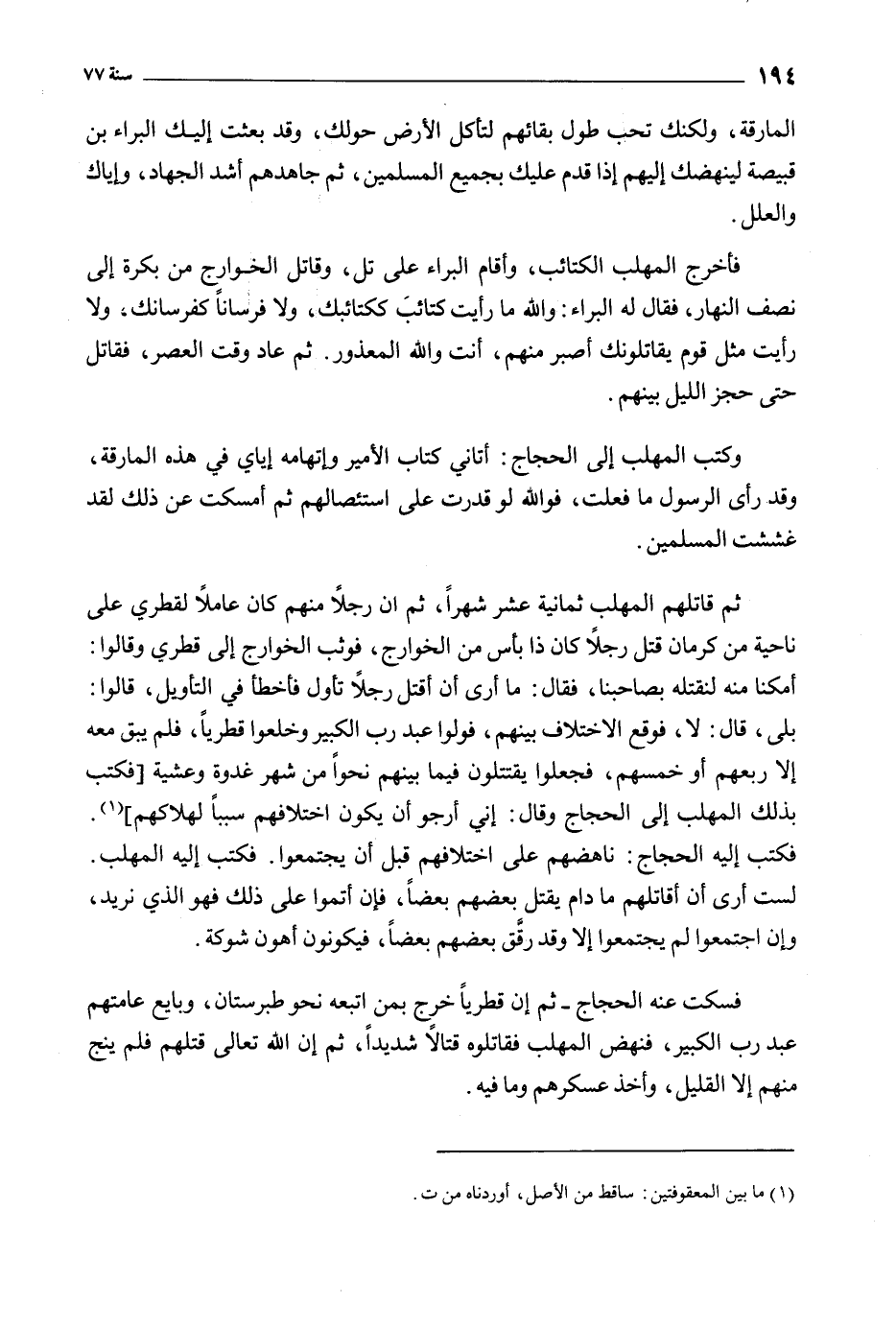 فسكت عنه الحجاج- ثم إن قطريا خرج بمن اتبعه نحو طبرستان، وبايع عامتهم عبد رب الكبير، فنهض المهلب فقاتلوه قتالا شديدا، ثم إن الله تعالى قتلهم فلم ينج منهم إلا القليل، وأخذ عسكرهم وما فيه.