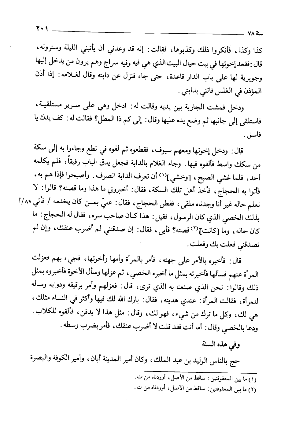 قال: ودخل إخوتها ومعهم سيوف، فقطعوه ثم لفوه في نطع وجاءوا به إلى سكة من سكك واسط فألقوه فيها. وجاء الغلام بالدابة فجعل يدق الباب رفيقا، فلم يكلمه أحد، فلما غشي الصبح، [وخشي] [1] أن تعرف الدابة انصرف. وأصبحوا فإذا هم به، فأتوا به الحجاج، فأخذ أهل تلك السكة، فقال: أخبروني ما هذا وما قصته؟ قالوا: لا نعلم حاله غير أنا وجدناه ملقى، ففطن الحجاج، فقال: علي بمن كان يخدمه/ فأتي بذلك الخصي الذي كان الرسول، فقيل: هذا كان صاحب سره، فقال له الحجاج: ما كان حاله، وما [كانت] [2] قصته؟ فأبى، فقال: إن صدقتني لم أضرب عنقك، وإن لم تصدقني فعلت بك وفعلت.