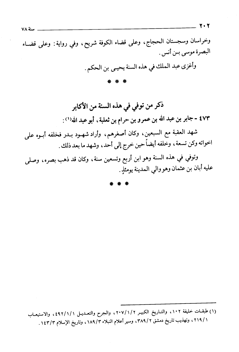 [1] طبقات خليفة 102، والتاريخ الكبير 2/ 1/ 207، والجرح والتعديل 1/ 1/ 492، والاستيعاب 1/ 219، وتهذيب تاريخ دمشق 2/ 389، وسير أعلام النبلاء 3/ 189، وتاريخ الإسلام 3/ 143.