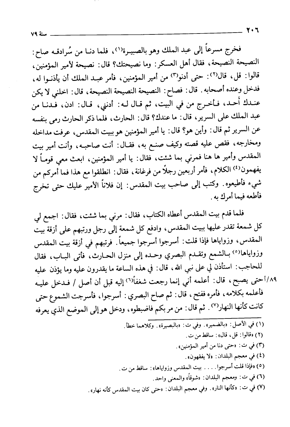 فلما قدم بيت المقدس أعطاه الكتاب، فقال: مرني بما شئت، فقال: اجمع لي كل شمعة تقدر عليها ببيت المقدس، وادفع كل شمعة إلى رجل ورتبهم على أزقة بيت المقدس، وزواياها فإذا قلت: أسرجوا أسرجوا جميعا. فرتبهم في أزقة بيت المقدس وزواياها [5] بالشمع وتقدم البصري وحده إلى منزل الحارث، فأتى الباب، فقال للحاجب: استأذن لي على نبي الله، قال: في هذه الساعة ما يقدرون عليه وما يؤذن عليه حتى يصبح، قال: أعلمه أني إنما رجعت شغفا [6] إليه قبل أن أصل/ فدخل عليه فأعلمه بكلامه، فأمره ففتح، قال: ثم صاح البصري: أسرجوا، فأسرجت الشموع حتى كانت كأنها النهار [7] . ثم قال: من مر بكم فاضبطوه، ودخل هو إلى الموضع الّذي يعرفه
