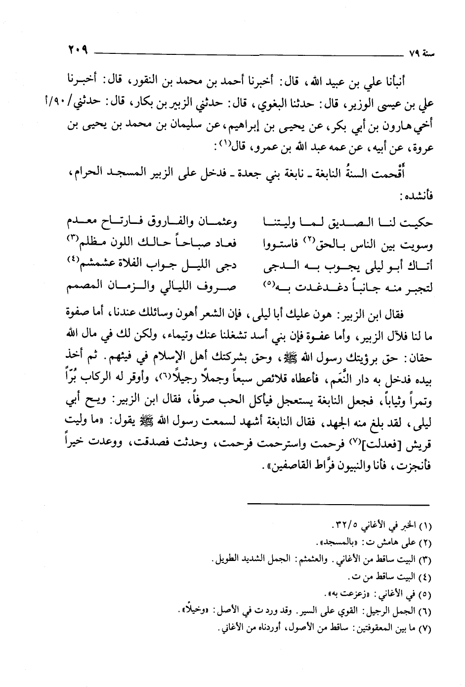 فَقَالَ ابْنُ الزُّبَيْرِ: هَوِّنْ عَلَيْكَ أَبَا لَيْلَى، فَإِنَّ الشِّعْرَ أهون وسائلك عندنا، أما صفوة مالنا فَلآلِ الزُّبَيْرِ، وَأَمَّا عَفْوَةُ فَإِنَّ بَنِي أَسَدٍ تَشْغِلُنَا عَنْكَ وَتَيْمَاءَ، وَلَكِنَّ لَكَ فِي مَالِ اللَّهِ حَقَّانِ: حَقٌّ بِرُؤْيَتِكَ رَسُولِ اللَّهِ صَلَّى الله عليه وآله وَسَلَّمَ، وَحَقٌّ بِشِرْكَتِكَ أَهْلِ الإِسْلامِ فِي فَيْئِهِمْ. ثم أخذ بيده فدخل به دار النّعم، فَأَعْطَاهُ قَلائِصَ سَبُعًا وَجَمَلا رَجِيلا [6] ، وَأَوْقَرَ لَهُ الرِّكَابَ بُرًّا وَتَمْرًا وَثِيَابًا، فَجَعَلَ النَّابِغَةُ يَسْتَعْجِلُ فَيَأْكُلُ الْحَبَّ صرفًا، فَقَالَ ابْنُ الزُّبَيْرِ: وَيْحَ أَبِي لَيْلَى، لَقَدْ بَلَغَ مِنْهُ الْجَهْدُ، فَقَالَ النَّابِغَةُ أَشْهَدُ لَسَمِعْتُ رَسُولَ اللَّهِ صَلَّى اللَّهُ عليه وآله وَسَلَّمَ يَقُولُ: «مَا وُلِّيَتْ قُرَيْشٌ [فَعَدَلْت] [7] فَرَحَمَتْ وَاسْتُرْحِمَتْ فَرَحَمَتْ، وَحَدَّثَتْ فَصَدَقَتْ، وَوَعَدَتْ خَيْرًا فَأَنْجَزَتْ، فأنا والنبيون فرّاط القاصفين» .