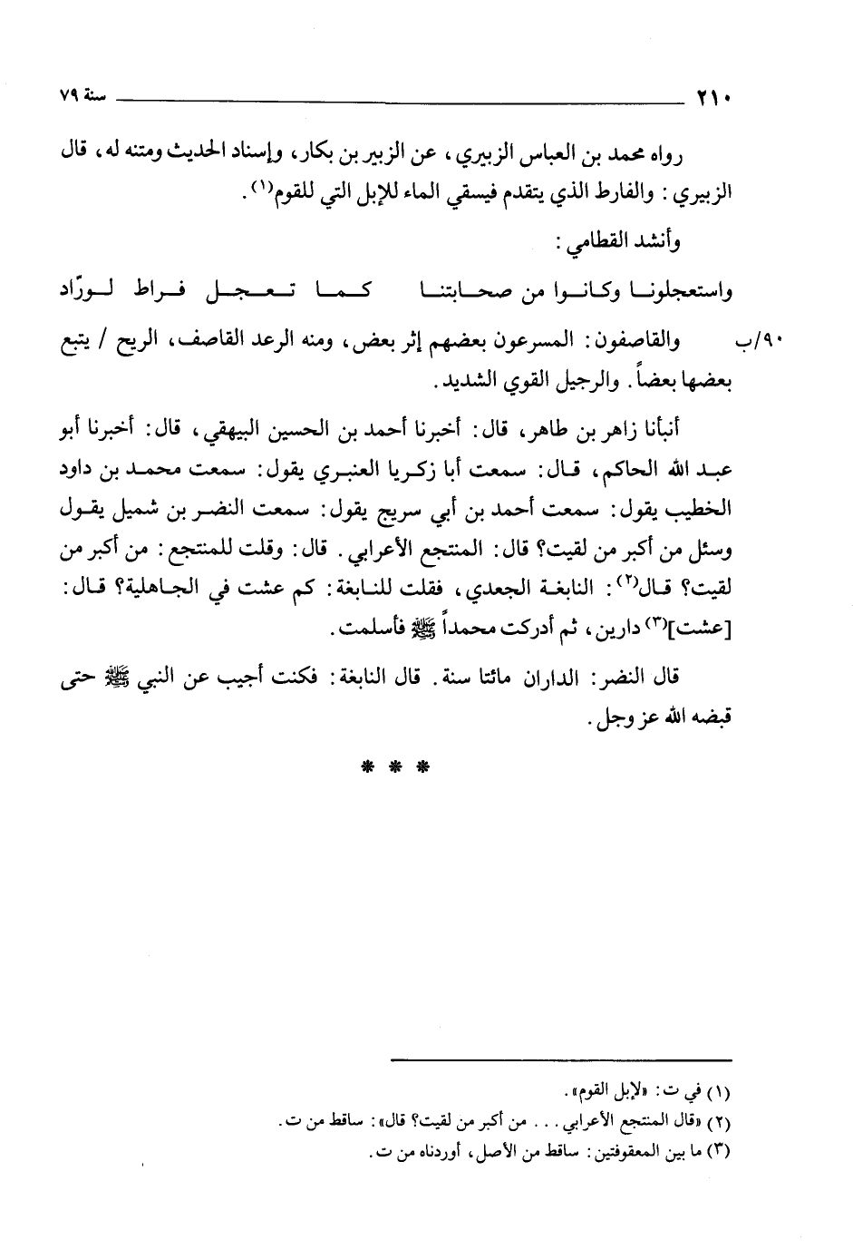 أَنْبَأَنَا زاهر بْن طاهر، قَالَ: أَخْبَرَنَا أَحْمَد بْن الحسين الْبَيْهَقِيُّ، قَالَ: أَخْبَرَنَا أَبُو عَبْدِ اللَّهِ الْحَاكِمُ، قال: سمعت أبا زكريا العنبري يقول: سمعت محمد بن داود الخطيب يقول: سمعت أحمد بن أبي سريج يقول: سمعت النضر بن شميل يقول وسئل من أكبر من لقيت؟ قال: المنتجع الأعرابي. قال: وقلت للمنتجع: من أكبر من لقيت؟ قال [2] : النابغة الجعدي، فقلت للنابغة: كم عشت في الجاهلية؟ قال: