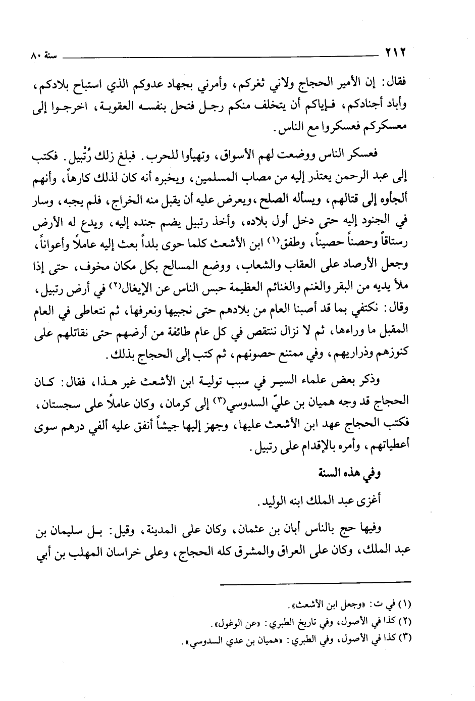 فعسكر الناس ووضعت لهم الأسواق، وتهيأوا للحرب. فبلغ ذلك رتبيل. فكتب إلى عبد الرحمن يعتذر إليه من مصاب المسلمين، ويخبره أنه كان لذلك كارها، وأنهم ألجئوه إلى قتالهم، ويسأله الصلح، ويعرض عليه أن يقبل منه الخراج، فلم يجبه، وسار في الجنود إليه حتى دخل أول بلاده، وأخذ رتبيل يضم جنده إليه، ويدع له الأرض رستاقا وحصنا حصينا، وطفق [1] ابن الأشعث كلما حوى بلدا بعث إليه عاملا وأعوانا، وجعل الأرصاد على العقاب والشعاب، ووضع المسالح بكل مكان مخوف، حتى إذا ملأ يديه من البقر والغنم والغنائم العظيمة حبس الناس عن الإيغال [2] في أرض رتبيل، وقال: نكتفي بما قد أصبنا العام من بلادهم حتى نجبيها ونعرفها، ثم نتعاطى في العام المقبل ما وراءها، ثم لا نزال ننتقص في كل عام طائفة من أرضهم حتى نقاتلهم على كنوزهم وذراريهم، وفي ممتنع حصونهم، ثم كتب إلى الحجاج بذلك.