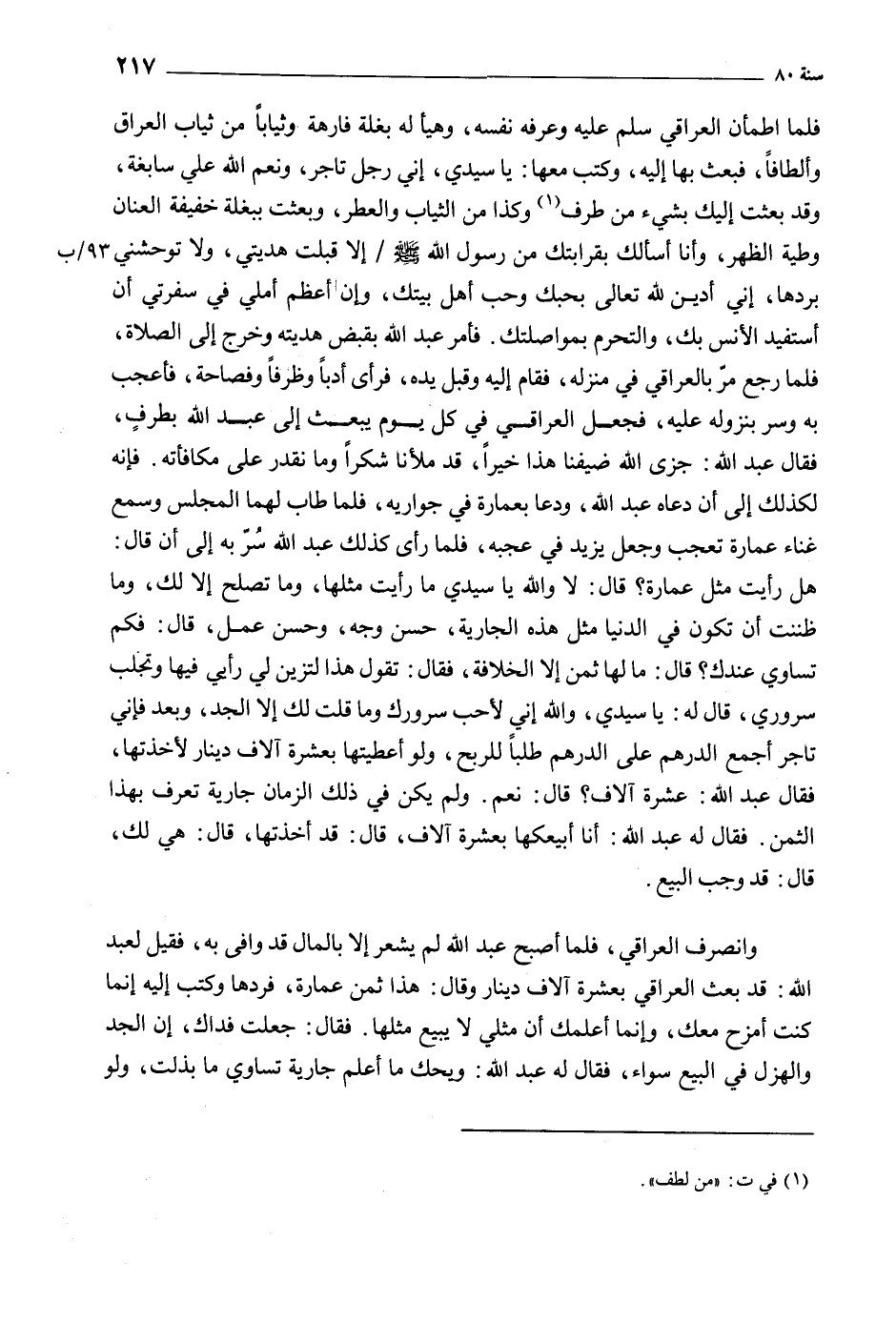وانصرف العراقي، فلما أصبح عبد الله لم يشعر إلا بالمال قد وافى به، فقيل لعبد الله: قد بعث العراقي بعشرة آلاف دينار وقال: هذا ثمن عمارة، فردها وكتب إليه إنما كنت أمزح معك، وإنما أعلمك أن مثلي لا يبيع مثلها. فقال: جعلت فداك، إن الجد والهزل في البيع سواء، فقال له عبد الله: ويحك ما أعلم جارية تساوي ما بذلت، ولو