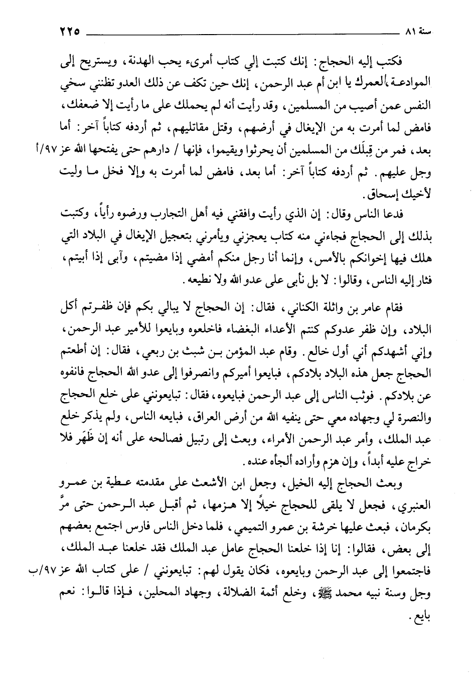 وبعث الحجاج إليه الخيل، وجعل ابن الأشعث على مقدمته عطية بن عمرو العنبري، فجعل لا يلقى للحجاج خيلا إلا هزمها، ثم أقبل عبد الرحمن حتى مر بكرمان، فبعث عليها خرشة بن عمرو التميمي، فلما دخل الناس فارس اجتمع بعضهم إلى بعض، فقالوا: إنا إذا خلعنا الحجاج عامل عبد الملك فقد خلعنا عبد الملك، فاجتمعوا إلى عبد الرحمن وبايعوه، فكان يقول لهم: تبايعونني/ على كتاب الله عز وجل وسنة نبيه محمد صلى الله عليه وآله وَسَلَّمَ، وخلع أئمة الضلالة، وجهاد المحلين، فإذا قالوا: نعم بايع.