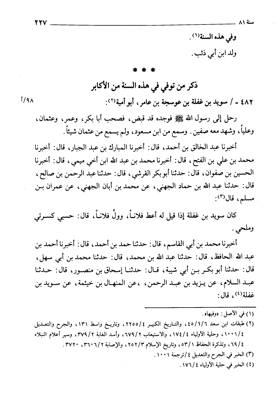 [2] طبقات ابن سعد 6/ 1/ 45، والتاريخ الكبير 4/ 2255، وتاريخ واسط 131، والجرح والتعديل 4/ 1001، وحلية الأولياء 4/ 174، والاستيعاب 2/ 679، وأسد الغابة 2/ 379، وسير أعلام النبلاء 4/ 69، وتذكرة الحفاظ 1/ 53، وتاريخ الإسلام 3/ 252، والإصابة 2/ 3606، 3720.