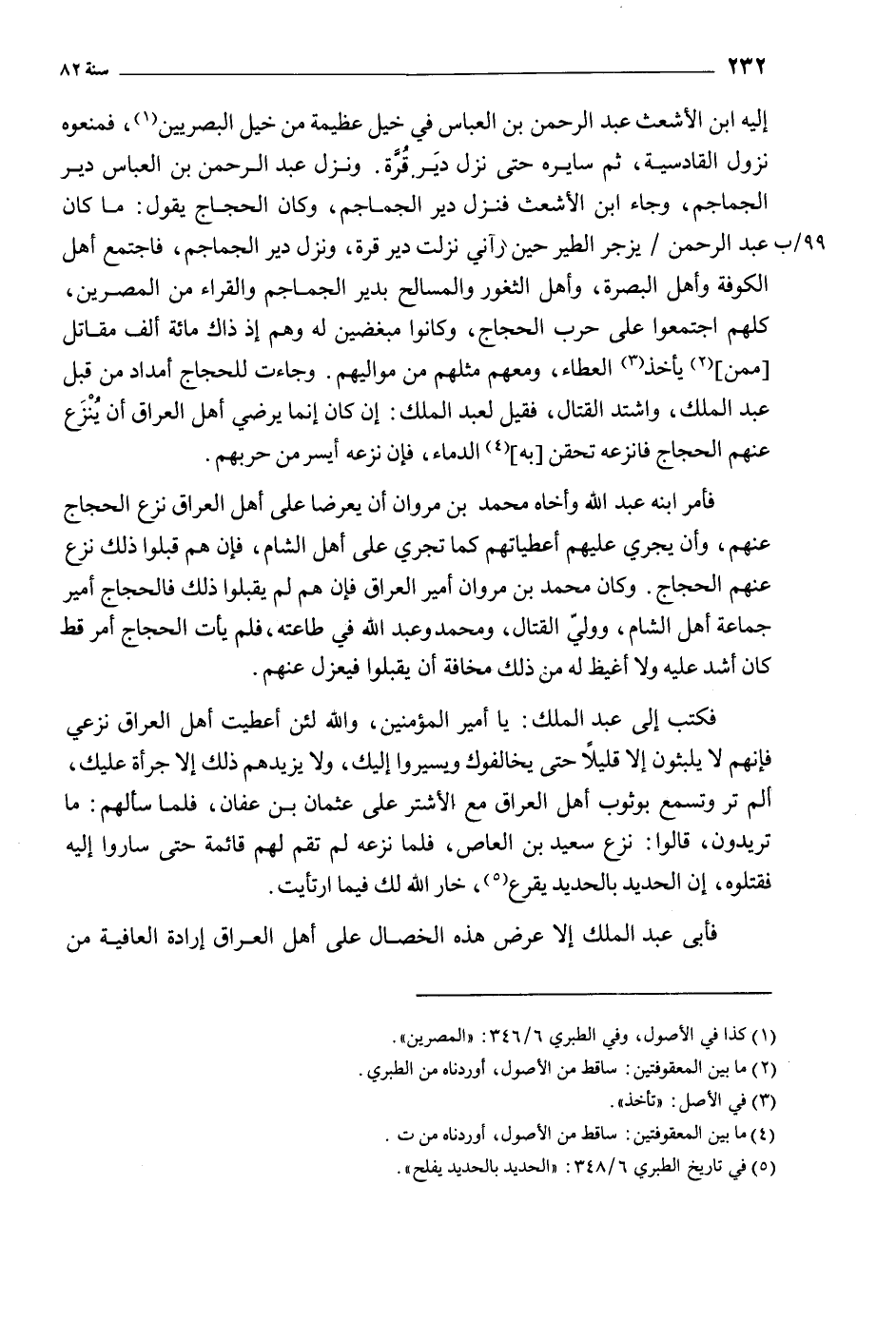 إليه ابن الأشعث عبد الرحمن بن العباس في خيل عظيمة من خيل البصريين [1] ، فمنعوه نزول القادسية، ثم سايره حتى نزل دير قرة. ونزل عبد الرحمن بن العباس دير الجماجم، وجاء ابن الأشعث فنزل دير الجماجم، وكان الحجاج يقول: ما كان عبد الرحمن/ يزجر الطير حين رآني نزلت دير قرة، ونزل دير الجماجم، فاجتمع أهل الكوفة وأهل البصرة، وأهل الثغور والمسالح بدير الجماجم والقراء من المصرين، كلهم اجتمعوا على حرب الحجاج، وكانوا مبغضين له وهم إذ ذاك مائة ألف مقاتل [ممن] [2] يأخذ [3] العطاء، ومعهم مثلهم من مواليهم. وجاءت للحجاج أمداد من قبل عبد الملك، واشتد القتال، فقيل لعبد الملك: إن كان إنما يرضي أهل العراق أن ينزع عنهم الحجاج فانزعه تحقن [به] [4] الدماء، فإن نزعه أيسر من حربهم.