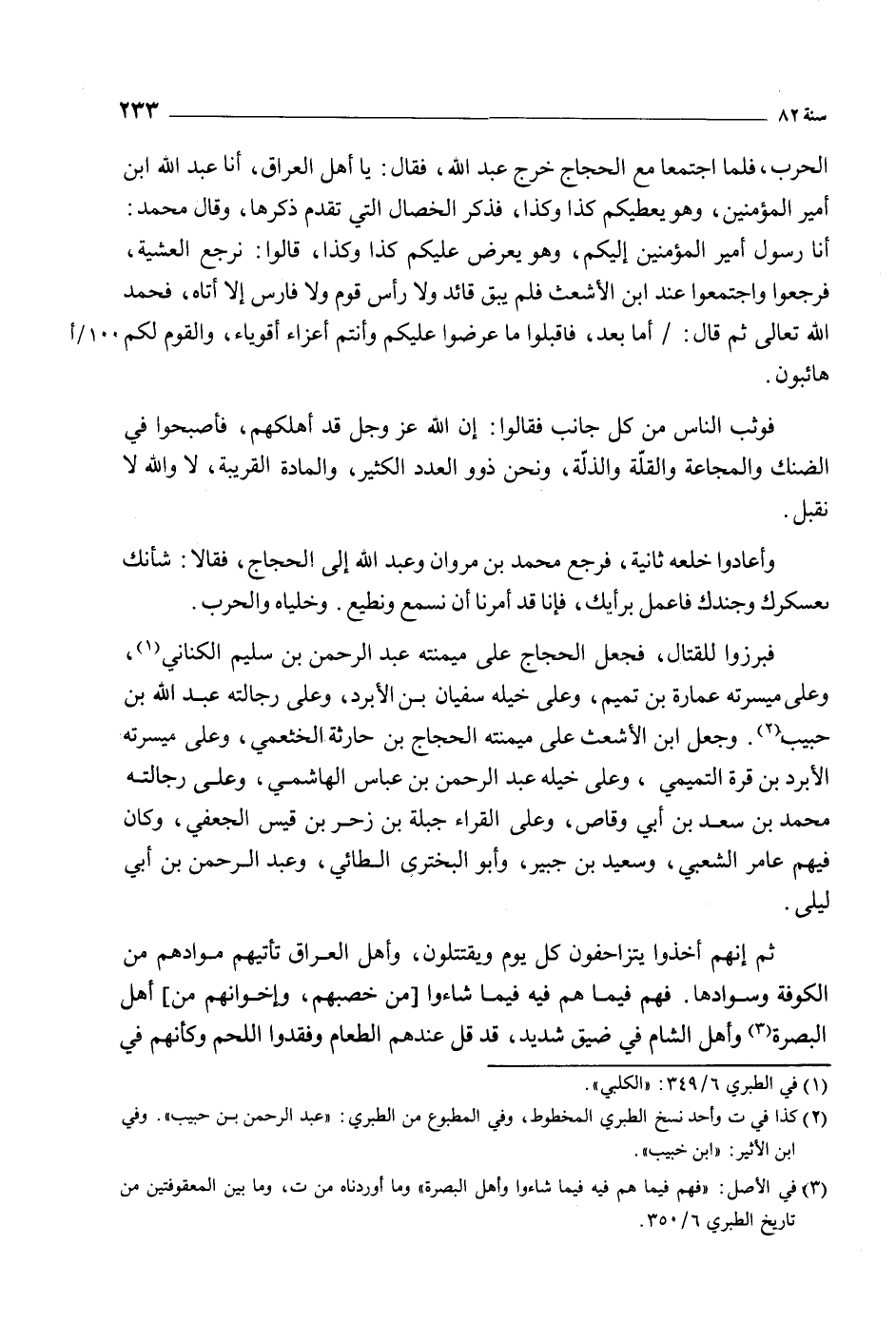 [3] في الأصل: «فهم فيما هم فيه فيما شاءوا وأهل البصرة» وما أوردناه من ت، وما بين المعقوفتين من تاريخ الطبري 6/ 350.