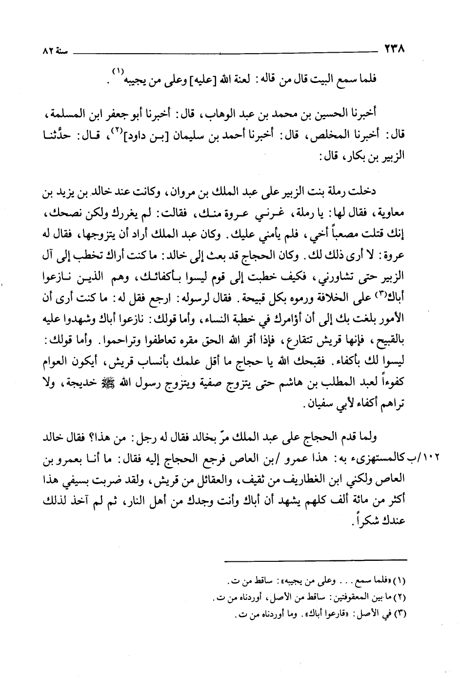 ليسوا لك بأكفاء. فقبحك الله يا حجاج ما أقل علمك بأنساب قريش، أيكون العوام كفؤا لعبد المطلب بن هاشم حتى يتزوج صفية ويتزوج رسول الله صَلى اللهُ عَلَيه وآله وَسَلَّمَ خديجة، ولا تراهم أكفاء لأبي سفيان.