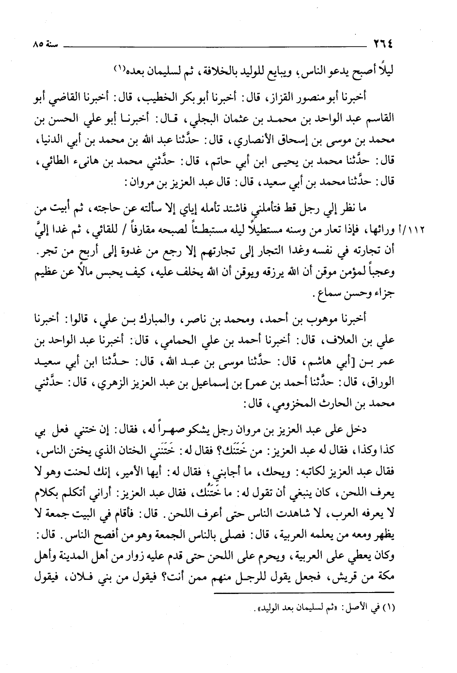 ليلا أصبح يدعو الناس، ويبايع للوليد بالخلافة، ثم لسليمان بعده [1] أخبرنا أبو منصور القزاز، قال: أخبرنا أبو بكر الخطيب، قَالَ: أَخْبَرَنَا الْقَاضِي أَبُو الْقَاسِمِ عَبْدُ الْوَاحِدِ بن محمد بن عثمان البجلي، قَالَ: أخبرنا أبو علي الحسن بن محمد بن موسى بن إسحاق الأنصاري، قال: حدثنا عبد الله بن محمد بن أبي الدنيا، قال: حدثنا محمد بن يحيى ابن أبي حاتم، قال: حدثني محمد بن هانئ الطائي، قال: حدثنا محمد بن أبي سعيد، قال: قال عبد العزيز بن مروان: