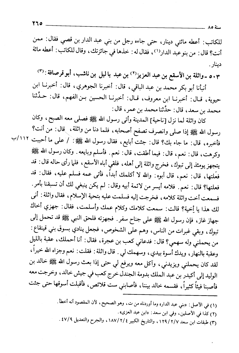 أَنْبَأَنَا أَبُو بَكْرٍ مُحَمَّدُ بْنُ عَبْدِ الْبَاقِي، قَالَ: أَخْبَرَنَا الْجَوْهَرِيُّ، قال: أخبرنا ابن حيوية، قال: أخبرنا ابن معروف، قال: أخبرنا الحسين بن الفهم، قال: حدثنا محمد بن سعد، قَالَ: حدثنا محمد بْنُ عُمَرَ، قَالَ: كَانَ وَاثِلَةُ لَمَّا نَزَلَ [نَاحِيَةَ] الْمَدِينَةِ وَأَتَى رَسُولُ اللَّهِ صَلَّى اللَّهُ عَلَيْهِ وَسَلَّمَ فصلى مَعَهُ الصُّبْحَ، وَكَانَ رَسُولُ اللَّهِ صَلَّى اللَّهُ عَلَيْهِ وَسَلَّمَ إِذَا صَلَّى وَانْصَرَفَ تَصَفَّحَ أَصْحَابَهُ، فَلَمَّا دَنَا مِنْ وَاثِلَةَ، قَالَ: مَنْ أَنْتَ؟