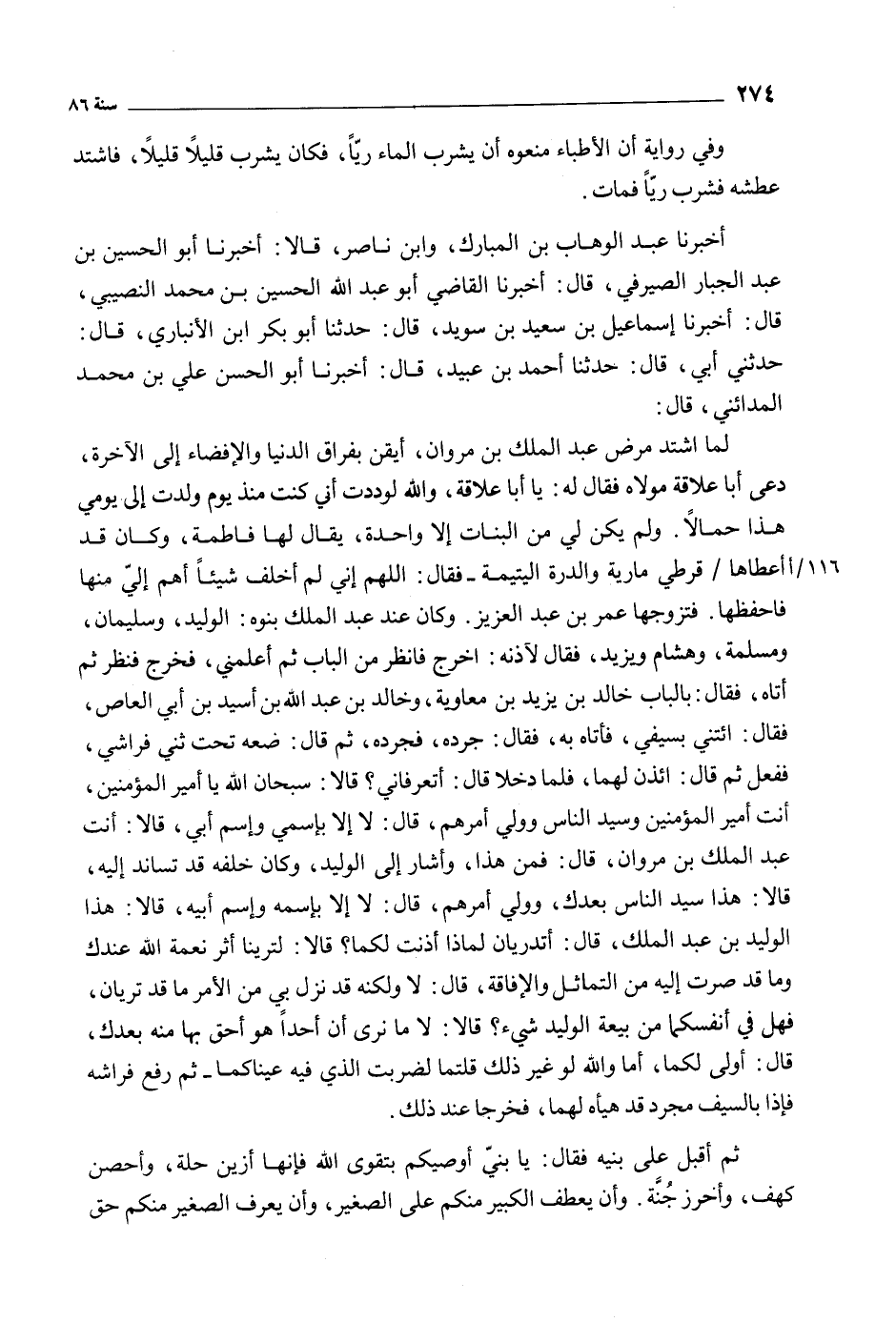 لما اشتد مرض عبد الملك بن مروان، أيقن بفراق الدنيا والإفضاء إلى الآخرة، دعى أبا علاقة مولاه فقال له: يا أبا علاقة، والله لوددت أني كنت منذ يوم ولدت إلى يومي هذا حمالا. ولم يكن لي من البنات إلا واحدة، يقال لها فاطمة، وكان قد أعطاها/ قرطي مارية والدرة اليتيمة- فقال: اللَّهمّ إني لم أخلف شيئا أهم إلي منها فاحفظها. فتزوجها عمر بن عبد العزيز. وكان عند عبد الملك بنوه: الوليد، وسليمان، ومسلمة، وهشام ويزيد، فقال لآذنه: اخرج فانظر من الباب ثم أعلمني، فخرج فنظر ثم أتاه، فقال: بالباب خالد بن يزيد بن معاوية، وخالد بن عبد الله بن أسيد بن أبي العاص، فقال: ائتني بسيفي، فأتاه به، فقال: جرده، فجرده، ثم قال: ضعه تحت ثني فراشي، ففعل ثم قال: ائذن لهما، فلما دخلا قال: أتعرفاني؟ قالا: سبحان الله يا أمير المؤمنين، أنت أمير المؤمنين وسيد الناس وولي أمرهم، قال: لا إلا باسمي واسم أبي، قالا: أنت عبد الملك بن مروان، قال: فمن هذا، وأشار إلى الوليد، وكان خلفه قد تساند إليه، قالا: هذا سيد الناس بعدك، وولي أمرهم، قال: لا إلا باسمه واسم أبيه، قالا: هذا الوليد بن عبد الملك، قال: أتدريان لماذا أذنت لكما؟ قالا: لترينا أثر نعمة الله عندك وما قد صرت إليه من التماثل والآفاقة، قال: لا ولكنه قد نزل بي من الأمر ما قد تريان، فهل في أنفسكما من بيعة الوليد شيء؟ قالا: لا ما نرى أن أحدا هو أحق بها منه بعدك، قال: أولى لكما، أما والله لو غير ذلك قلتما لضربت الّذي فيه عيناكما- ثم رفع فراشه فإذا بالسيف مجرد قد هيأه لهما، فخرجا عند ذلك.