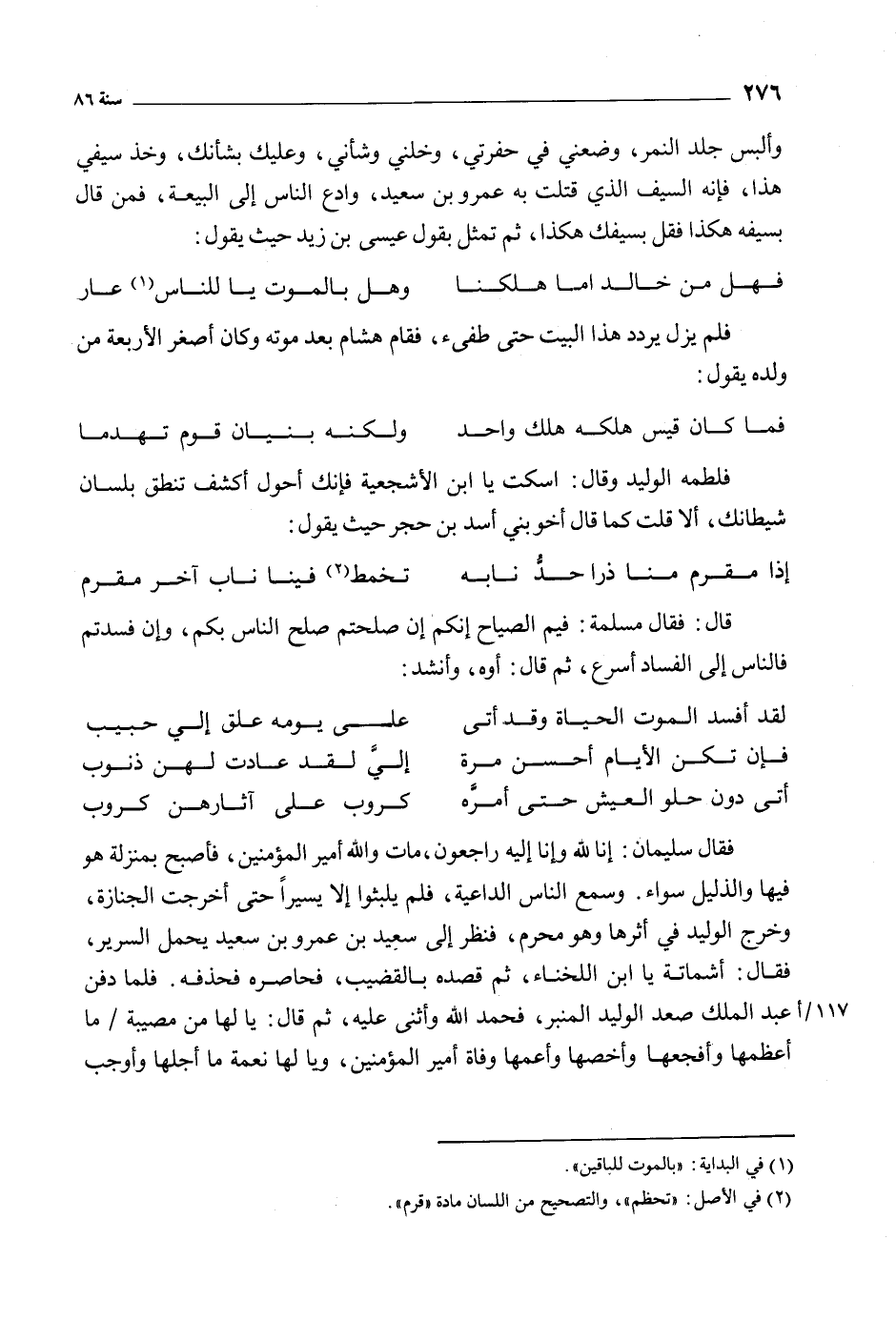 فقال سليمان: إِنَّا لِلَّهِ وَإِنَّا إِلَيْهِ راجِعُونَ 2: 156، مات والله أمير المؤمنين، فأصبح بمنزلة هو فيها والذليل سواء. وسمع الناس الداعية، فلم يلبثوا إلا يسيرا حتى أخرجت الجنازة، وخرج الوليد في أثرها وهو محرم، فنظر إلى سعيد بن عمرو بن سعيد يحمل السرير، فقال: أشماتة يا ابن اللخناء، ثم قصده بالقضيب، فحاصره فحذفه. فلما دفن عبد الملك صعد الوليد الْمِنْبَرَ، فَحَمِدَ اللَّهَ وَأَثْنَى عَلَيْهِ، ثُمّ قَالَ: يا لها من مصيبة/ ما أعظمها وأفجعها وأخصها وأعمها وفاة أمير المؤمنين، ويا لها نعمة ما أجلها وأوجب