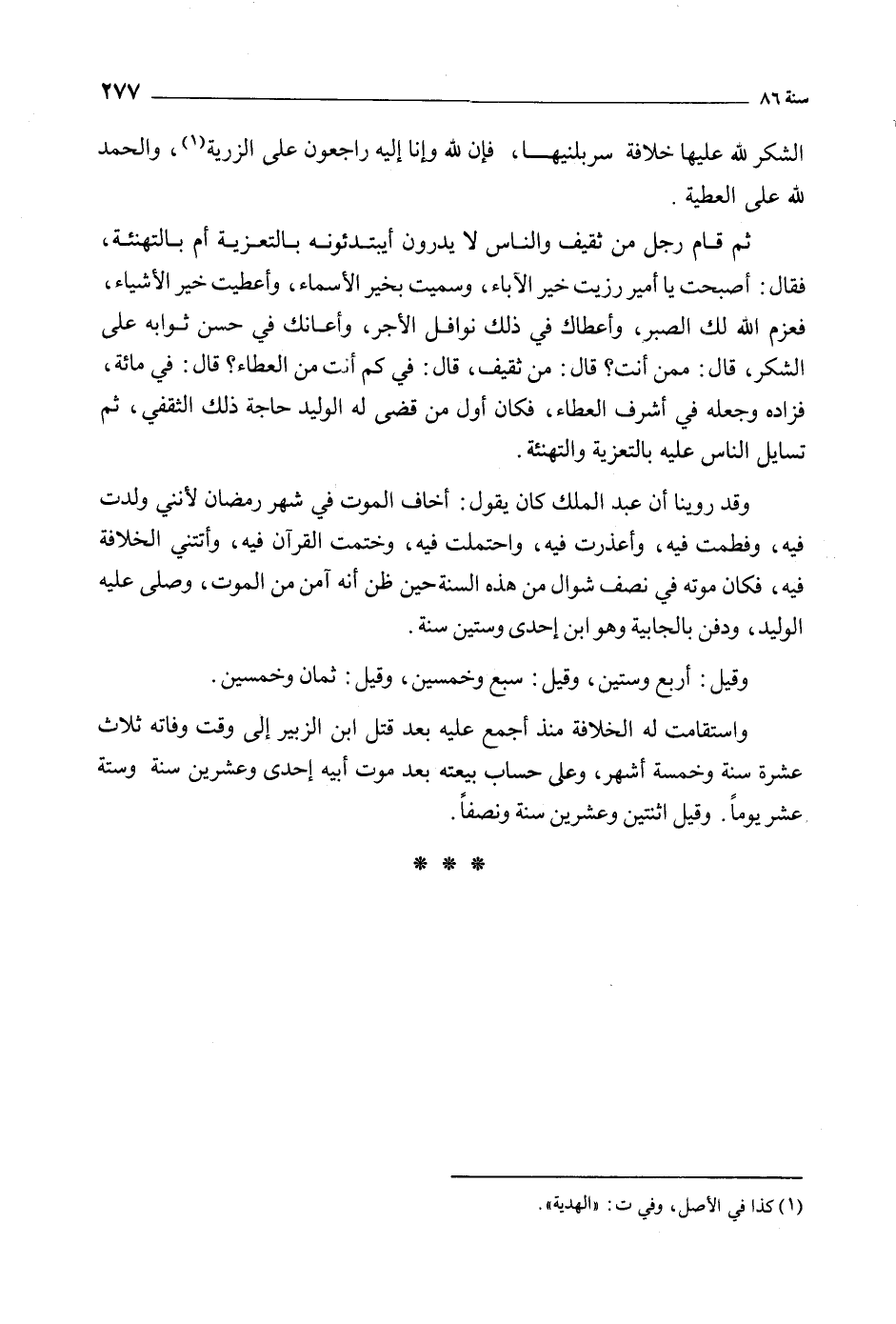 ثم قام رجل من ثقيف والناس لا يدرون أيبتدئونه بالتعزية أم بالتهنئة، فقال: أصبحت يا أمير رزيت خير الآباء، وسميت بخير الأسماء، وأعطيت خير الأشياء، فعزم الله لك الصبر، وأعطاك في ذلك نوافل الأجر، وأعانك في حسن ثوابه على الشكر، قال: ممن أنت؟ قال: من ثقيف، قال: في كم أنت من العطاء؟ قال: في مائة، فزاده وجعله في أشرف العطاء، فكان أول من قضى له الوليد حاجة ذلك الثقفي، ثم تسايل الناس عليه بالتعزية والتهنئة.
