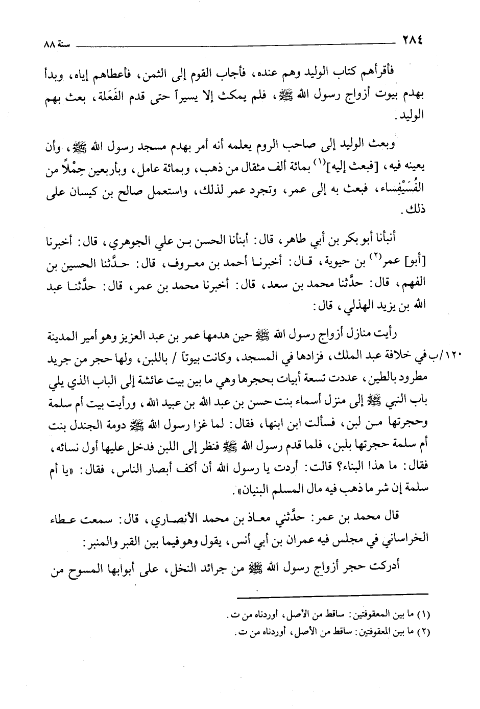 أَنْبَأَنَا أبو بكر بن أبي طاهر، قَالَ: أَنْبَأَنَا الْحَسَنُ بْنُ عَلِيٍّ الْجَوْهَرِيُّ، قَالَ: أَخْبَرَنَا [أَبُو] عمر [2] بْن حيويه، قَالَ: أخبرنا أحمد بْنُ مَعْرُوفٍ، قَالَ: حَدَّثَنَا الْحُسَيْنُ بْنُ الْفَهِمِ، قال: حدثنا محمد بن سعد، قال: أخبرنا مُحَمَّدُ بْنُ عُمَرَ، قَالَ: حَدَّثَنَا عَبْدُ اللَّهِ بْن يَزِيدَ الْهُذَلِيُّ، قَالَ: رَأَيْتُ مَنَازِلَ أَزْوَاجِ رَسُولِ اللَّهِ صَلَّى اللَّهُ عَلَيْهِ وَسَلَّمَ حِينَ هَدَمَهَا عُمَرُ بْنُ عَبْدِ الْعَزِيزِ وَهُوَ أَمِيرُ الْمَدِينَةِ فِي خِلافَةِ عَبْدِ الْمَلِكِ، فَزَادَهَا فِي الْمَسْجِدِ، وَكَانَتِ بُيُوتًا/ بِاللَّبِنِ، وَلَهَا حُجَرٌ مِنْ جَرِيدٍ مَطْرُودٍ بِالطِّينِ، عَدَدْتُ تِسْعَةَ أَبْيَاتٍ بِحُجَرِهَا وَهِيَ مَا بَيْنَ بَيْتِ عَائِشَةَ إِلَى الْبَابِ الَّذِي يَلِي بَابَ النَّبِيِّ صَلَّى اللَّهُ عَلَيه وَسَلَّمَ إِلَى مَنْزِلِ أَسْمَاءَ بِنْتِ حَسَنِ بْنِ عَبْدِ اللَّهِ بْنِ عُبَيْدِ اللَّهِ، وَرَأَيْتُ بَيْتَ أُمِّ سَلَمَةَ وَحُجْرَتُهَا مِنْ لَبِنٍ، فَسَأَلْتُ ابْنَ ابْنِهَا، فَقَالَ: لَمَّا غَزَا رَسُولُ اللَّهِ صَلَّى اللَّهُ عَلَيْهِ وَسَلَّمَ دَوْمَةَ الْجَنْدَلِ بَنَتْ أُمُّ سَلَمَةَ حُجْرَتَهَا بِلَبِنٍ، فَلَمَّا قَدِمَ رَسُولُ اللَّهِ صَلَّى اللَّهُ عَلَيْهِ وَسَلَّمَ فَنَظَرَ إِلَى اللَّبِنِ فَدَخَلَ عَلَيْهَا أَوَّلَ نِسَائِهِ، فَقَالَ: مَا هَذَا الْبِنَاءُ؟ قَالَتْ: أَرَدْتُ يَا رَسُولَ اللَّهِ أَنْ أَكُفَّ أَبْصَارَ النَّاسِ، فَقَالَ: «يَا أُمَّ سَلَمَةَ إِنَّ شَرَّ مَا ذَهَبَ فِيهِ مَالُ الْمُسْلِمِ الْبُنْيَانُ» . قال محمد بن عمر: حدثني معاذ بن محمد الأنصاري، قال: سمعت عطاء الخراساني في مجلس فيه عمران بن أبي أنس، يقول وهو فيما بين القبر والمنبر: