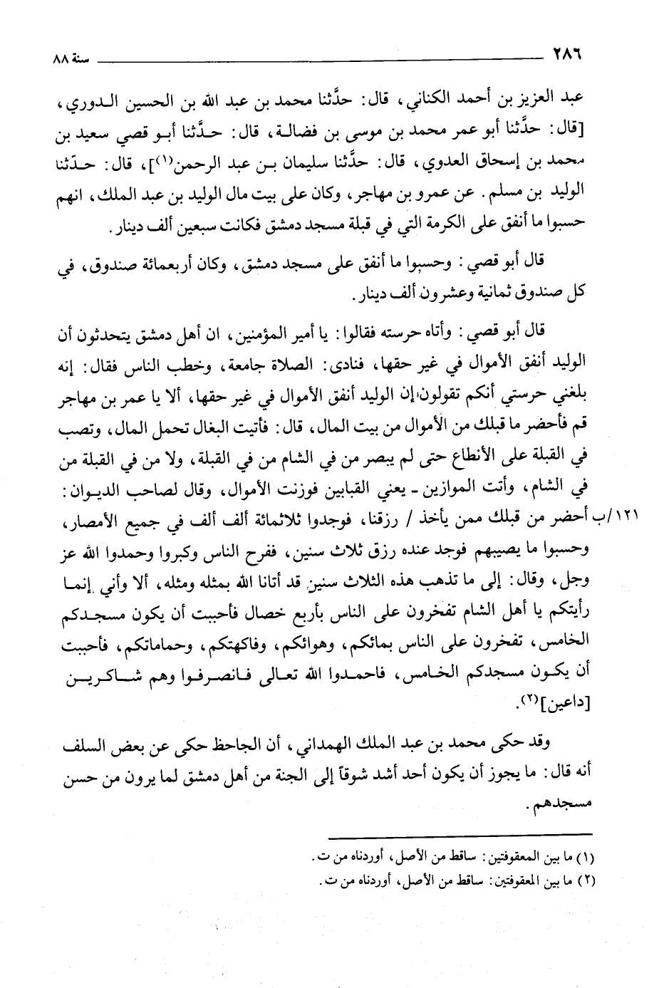 عبد العزيز بن أحمد الكناني، قال: حدثنا محمد بن عبد الله بن الحسين الدوري، [قال: حدثنا أبو عمر محمد بن موسى بن فضالة، قال: حدثنا أبو قصي سعيد بن محمد بن إسحاق العدوي، قال: حدثنا سليمان بن عبد الرحمن [1]] ، قال: حدثنا الوليد بن مسلم. عن عمرو بن مهاجر، وكان على بيت مال الوليد بن عبد الملك، أنهم حسبوا ما انفق على الكرمة التي في قبلة مسجد دمشق فكانت سبعين ألف دينار.