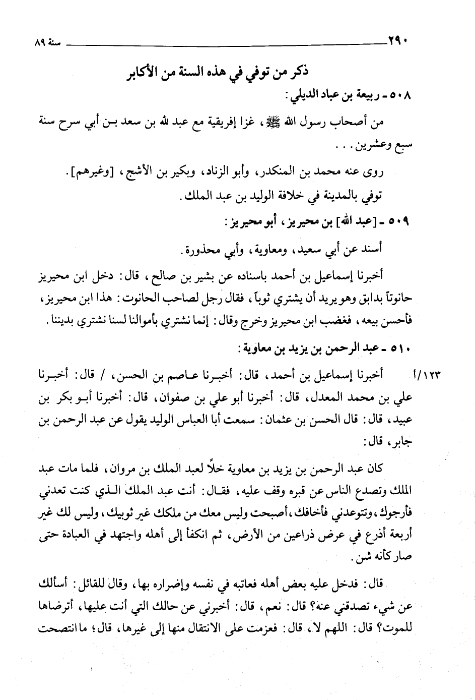 أَخْبَرَنَا إِسْمَاعِيلُ بْنُ أَحْمَدُ، قَالَ: أَخْبَرَنَا عَاصِمُ بن الحسن، / قال: أخبرنا علي بن محمد المعدل، قال: أخبرنا أبو علي بْن صفوان، قَالَ: أَخْبَرَنَا أَبُو بكر بْن عبيد، قال: قال الحسن بن عثمان: سمعت أبا العباس الوليد يقول عن عبد الرحمن بن جابر، قال: