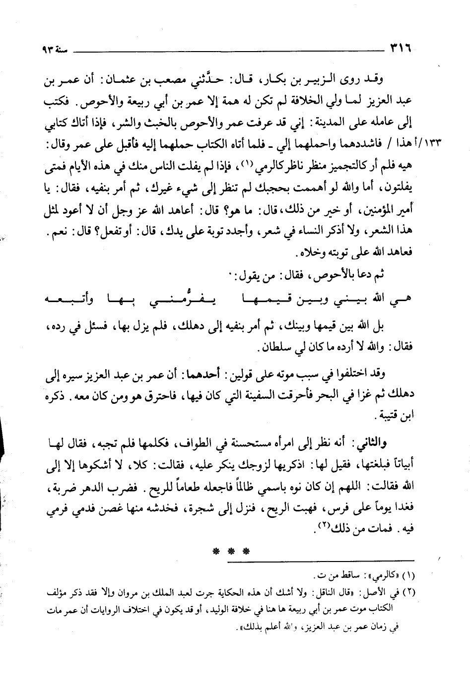 [2] في الأصل: «قال الناقل: ولا أشك أن هذه الحكاية جرت لعبد الملك بن مروان وإلا فقد ذكر مؤلف الكتاب موت عمر بن أبي ربيعة ها هنا في خلافة الوليد، أو قد يكون في اختلاف الروايات أن عمر مات في زمان عمر بن عبد العزيز، والله أعلم بذلك» .