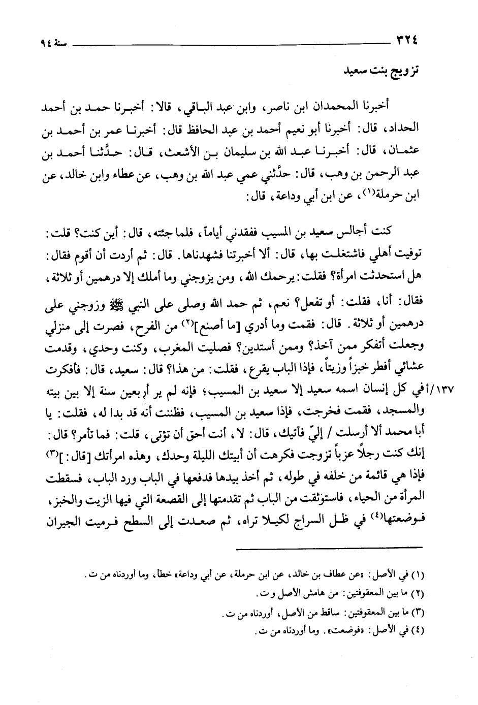 هل استحدثت امرأة؟ فقلت: يرحمك الله، ومن يزوجني وما أملك إلا درهمين أو ثلاثة، فقال: أنا، فقلت: أو تفعل؟ نعم، ثم حمد الله وصلى على النبي صَلى اللهُ عَلَيه وَسَلَّمَ وزوجني على درهمين أو ثلاثة. قال: فقمت وما أدري [ما أصنع] [2] من الفرح، فصرت إلى منزلي وجعلت أتفكر ممن آخذ؟ وممن أستدين؟ فصليت المغرب، وكنت وحدي، وقدمت عشائي أفطر خبزا وزيتا، فإذا الباب يقرع، فقلت: من هذا؟ قال: سعيد، قال: فأفكرت في كل إنسان اسمه سعيد إلا سعيد بن المسيب، فإنه لم ير أربعين سنة إلا بين بيته والمسجد، فقمت فخرجت، فإذا سعيد بن المسيب، فإنه قد بدا له، فقلت: يا أبا محمد ألا أرسلت/ إلي فآتيك، قال: لا، أنت أحق أن تؤتى، قلت: فما تأمر؟ قال: