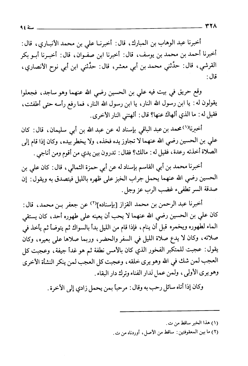 أخبرنا أحمد بن محمد بن يوسف، قَالَ: أَخْبَرَنَا ابْن صفوان، قَالَ: أَخْبَرَنَا أَبُو بكر القرشي، قال: حدّثني محمد بن أبي معشر، قال: حدثني ابن أبي نوح الأنصاري، قال: وقع حريق في بيت فيه علي بن الحسين رضي الله عنهما وهو ساجد، فجعلوا يقولون له: يا ابن رسول الله النار، يا ابن رسول الله النار، فما رفع رأسه حتى أطفئت، فقيل له: ما الذي ألهاك عنها؟ قال: ألهتني النار الأخرى. أَخْبَرَنَا [1] مُحَمَّد بْن عَبْد الباقي بإسناد لَهُ عن عبد الله بن أبي سليمان، قال: كان علي بن الحسين رضي الله عنهما لا تجاوز يده فخذه، ولا يخطر بيده، وكان إذا قام إلى الصلاة أخذته رعدة، فقيل له: مالك؟ فقال: تدرون بين يدي من أقوم ومن أناجي. أخبرنا محمد بن أبي القاسم بإسناد له عن أبي حمزة الثمالي، قال: كان علي بن الحسين رضي الله عنهما يحمل جراب الخبز على ظهره بالليل فيتصدق به ويقول: إن صدقة السر تطفئ غضب الرب عز وجل. أخبرنا عبد الرحمن بن محمد القزاز [بإسناده] [2] عن جعفر بن محمد، قال: كان علي بن الحسين رضي الله عنهما لا يحب أن يعينه على طهوره أحد، كان يستقي الماء لطهوره ويخمره قبل أن ينام، فإذا قام من الليل بدأ بالسواك ثم يتوضأ ثم يأخذ في صلاته، وكان لا يدع صلاة الليل في السفر والحضر، وربما صلاها على بعيره، وكان يقول: عجبت للمتكبر الفخور الذي كان بالأمس نطفة ثم هو غدا جيفة، وعجبت كل العجب لمن شك في الله وهو يرى خلقه، وعجبت كل العجب لمن ينكر النشأة الأخرى وهو يرى الأولى، ولمن عمل لدار الفناء وترك دار البقاء.
