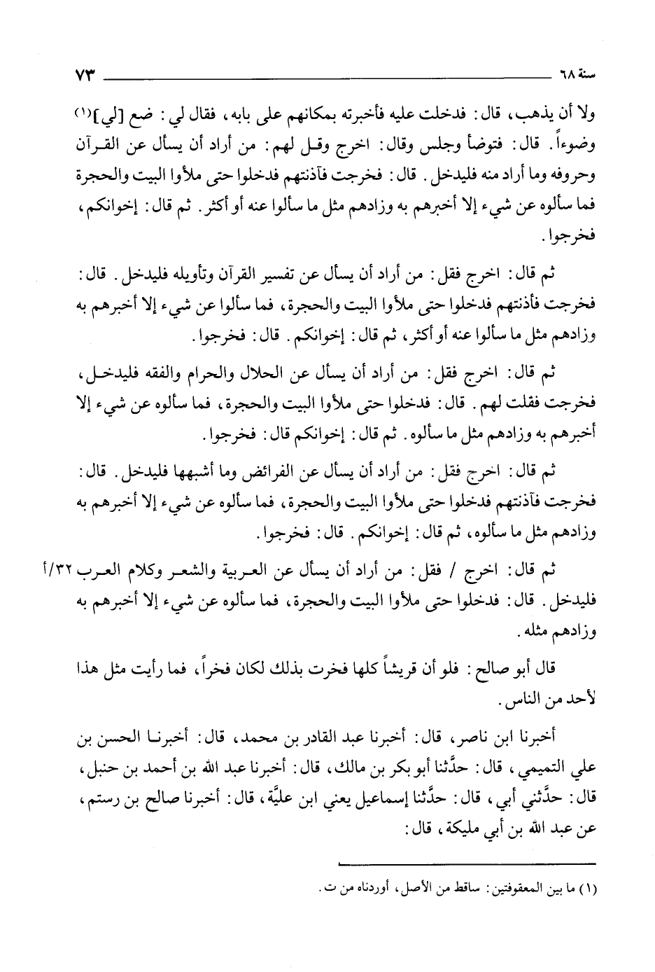 ثُمَّ قَالَ: اخْرُجْ فَقُلْ: مَنْ أَرَادَ أَنْ يَسْأَلَ عَنِ الْحَلالِ وَالْحَرَامِ وَالْفِقْهِ فَلْيَدْخُلْ، فَخَرَجْتُ فَقُلْتُ لهم. قال: فدخلوا حتى ملئوا الْبَيْتَ وَالْحُجْرَةَ، فَمَا سَأَلُوهُ عَنْ شَيْءٍ إِلا أَخْبَرَهُمْ بِهِ وَزَادَهُمْ مِثْلَ مَا سَأَلُوهُ. ثُمَّ قَالَ: إِخْوَانُكُمْ قَالَ: فَخَرَجُوا.