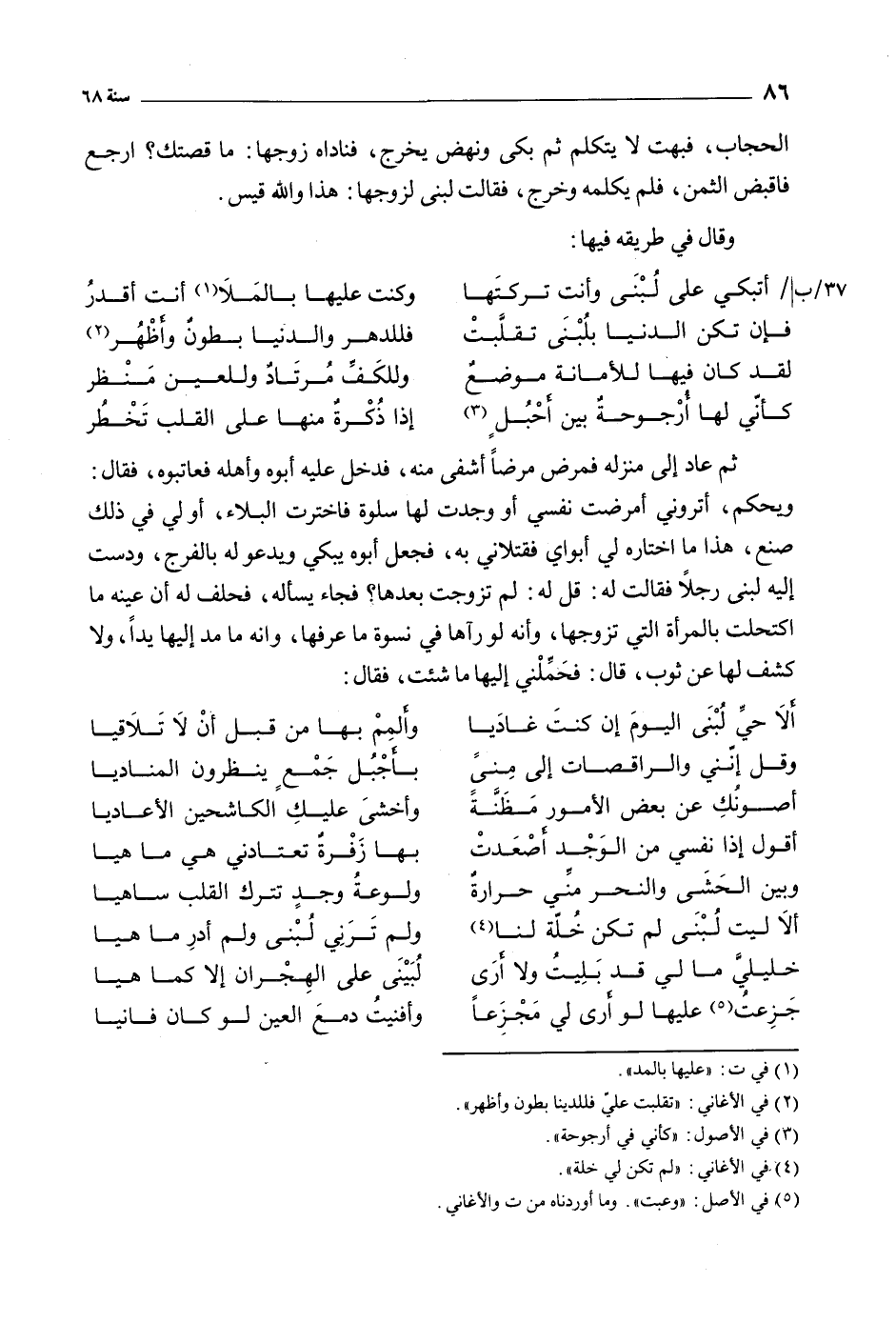 الحجاب، فبهت لا يتكلم ثم بكى ونهض يخرج، فناداه زوجها: ما قصتك؟ ارجع فاقبض الثمن، فلم يكلمه وخرج، فقالت لبنى لزوجها: هذا والله قيس.