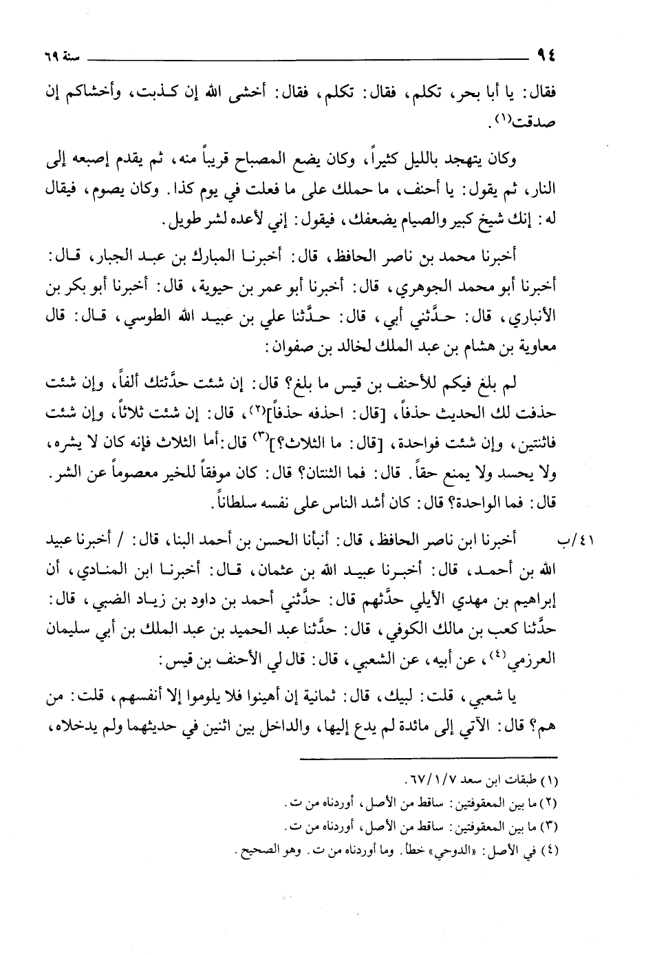 حدثنا كعب بن مالك الكوفي، قال: حدثنا عبد الحميد بن عبد الملك بن أبي سليمان العرزمي [4] ، عن أبيه، عن الشعبي، قال: قال لي الأحنف بن قيس:
