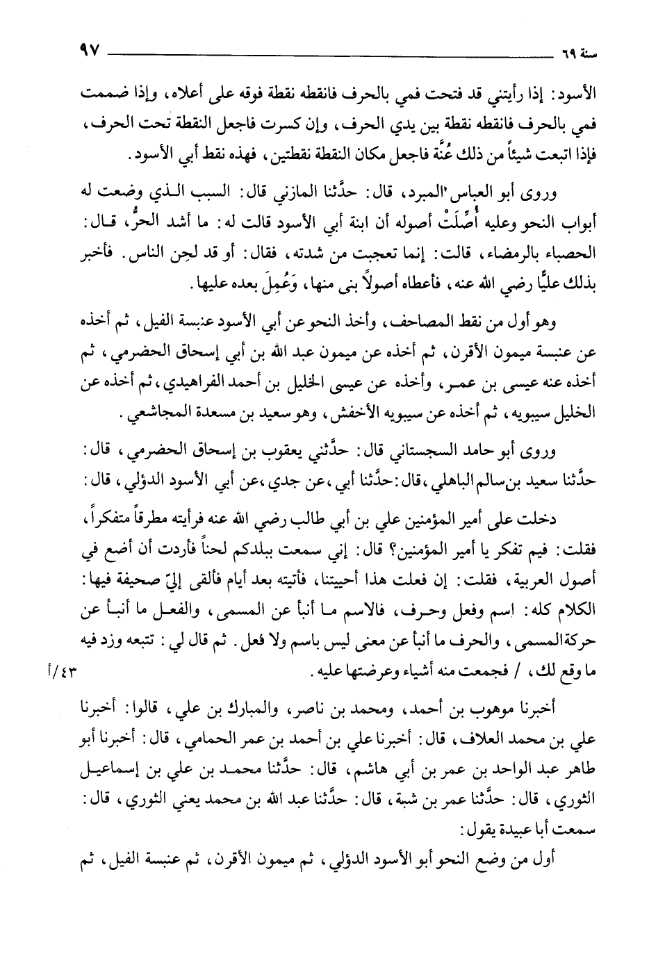 حدثنا سعيد بن سالم الباهلي، قَالَ: حَدَّثَنَا أَبِي، عَنْ جَدِّي، عَنْ أَبِي الأسود الدؤلي، قال: دخلت على أَمِيرِ الْمُؤْمِنِينَ عَلِيِّ بْنِ أَبِي طَالِبٍ رَضِيَ الله عنه فرأيته مطرقا متفكرا، فقلت: فيم تفكر يا أمير المؤمنين؟ قال: إني سمعت ببلدكم لحنا فأردت أن أضع في أصول العربية، فقلت: إن فعلت هذا أحييتنا، فأتيته بعد أيام فألقى إلي صحيفة فيها:
