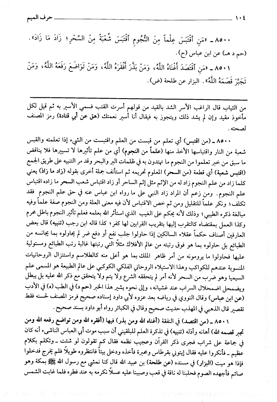 - - - - - - - - - - - - - - - - - - - 8500 - (من اقتبس) أي تعلم من قبست من العلم واقتبست من الشئ إذا تعلمته والقبس شعبة من النار واقتباسها الأخذ منها (علما من النجوم) أي من علم تأثيرها لا تسييرها فلا يناقض ما سبق من خبر تعلموا من النجوم ما تهتدون به في ظلمات البر والبحر وقد مر التنبيه على طريق الجمع (اقتبس شعبة) أي قطعة (من السحر) المعلوم تحريمه ثم استأنف جملة أخرى بقوله (زاد ما زاد) يعنى كلما زاد من علم النجوم زاد له من الإثم مثل إثم الساحر أو زاد اقتباس شعب السحر ما زاده اقتباس علم النجوم ، ومن زعم أن المراد زاد النبي على ما رواه ابن عباس عنه في حق علم النجوم فقد تكلف ، ونكر علما للتقليل ومن ثم خص الاقتباس لأن فيه معنى العلة ومن النجوم صفة علما وفيه مبالغة ، ذكره الطيبي ، وذلك لأنه يحكم على الغيب الذي استأثره الله بعلمه فعلم تأثير النجوم باطل محرم وكذا العمل بمقتضاه كالتقرب إليها بتقريب القرابين لها كفر ، كذا قاله ابن رجب.