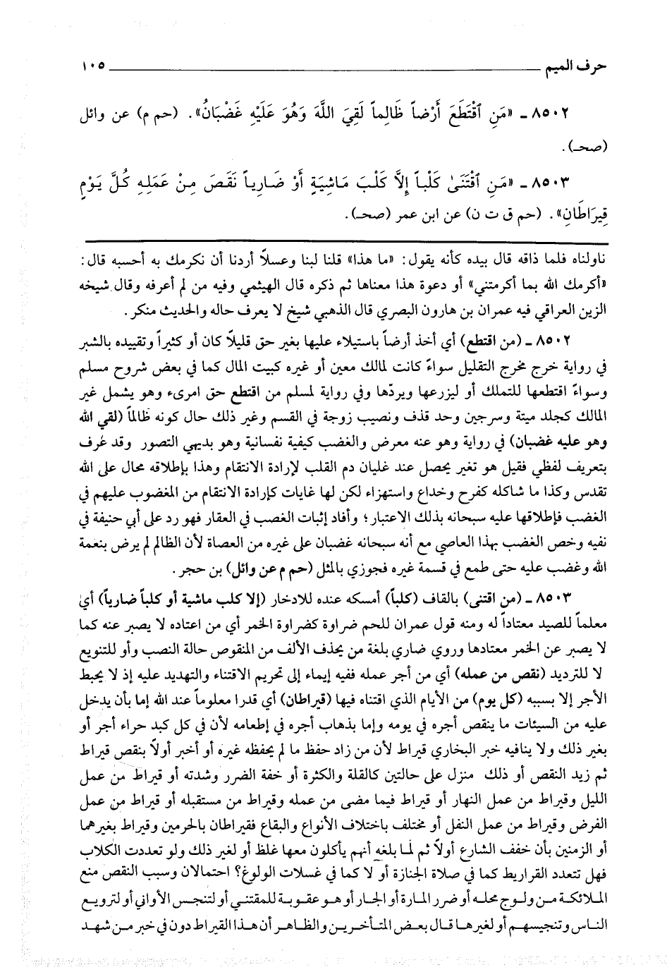 8502 - (من اقتطع) أي أخذ أرضا باستيلاء عليها بغير حق قليلا كان أو كثيرا وتقييده بالشبر في رواية خرج مخرج [ ص 81 ] التقليل سواء كانت لمالك معين أو غيره كبيت المال كما في بعض شروح مسلم وسواء اقتطعها للتملك أو ليزرعها ويردها وفي رواية لمسلم من اقتطع حق امرئ وهو يشمل غير المالك كجلد ميتة وسرجين وحد قذف ونصيب زوجة في القسم وغير ذلك حال كونه ظالما (لقي الله وهو عليه غضبان) في رواية وهو عنه معرض والغضب كيفية نفسانية وهو بديهي التصور وقد عرف