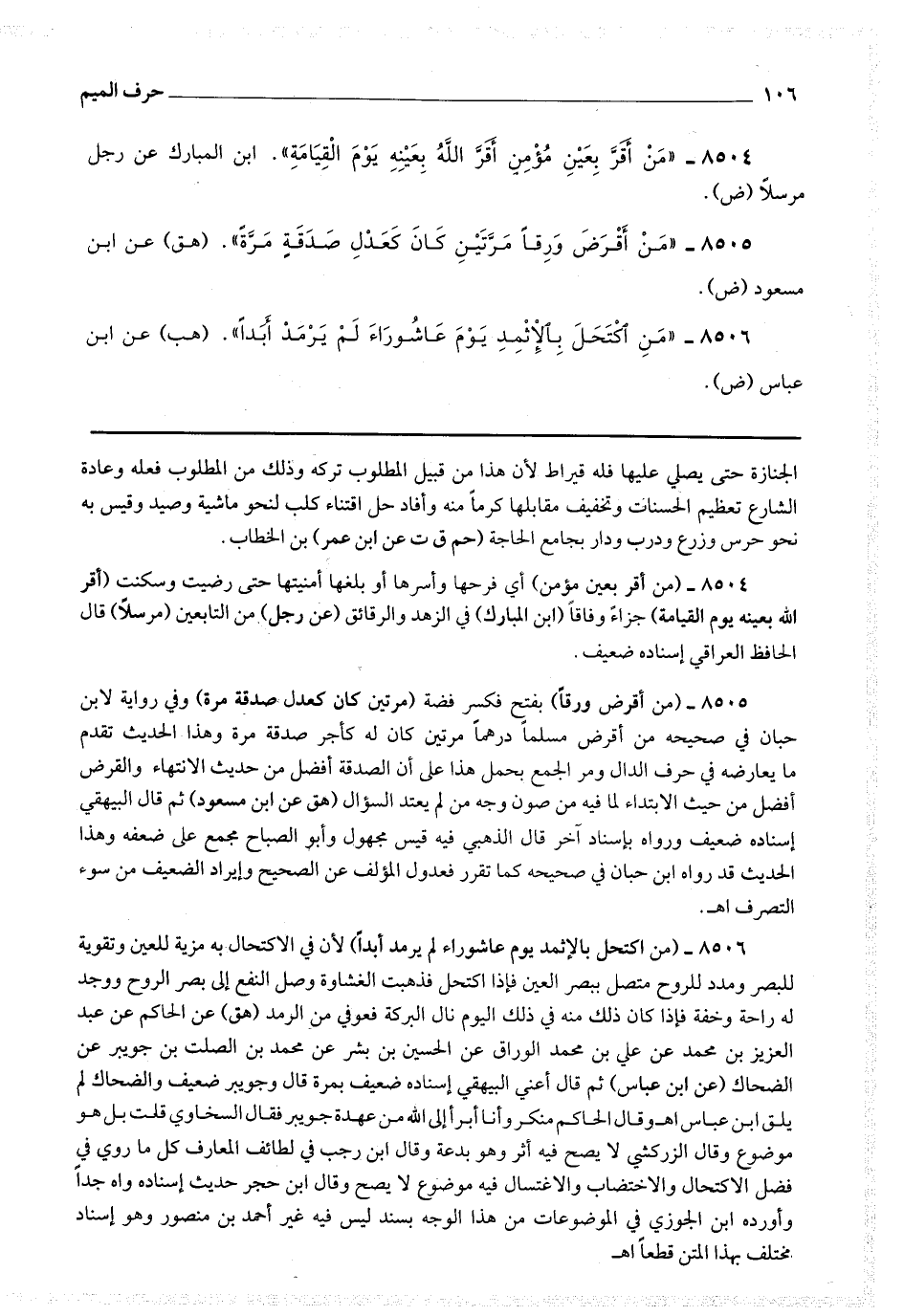 - (هق عن ابن مسعود) ثم قال البيهقي: إسناده ضعيف ورواه بإسناد آخر قال الذهبي: فيه قيس مجهول وأبو الصباح [ص 82] مجمع على ضعفه وهذا الحديث قد رواه ابن حبان في صحيحه كما تقرر فعدول المؤلف عن الصحيح وإيراد الضعيف من سوء التصرف اه.