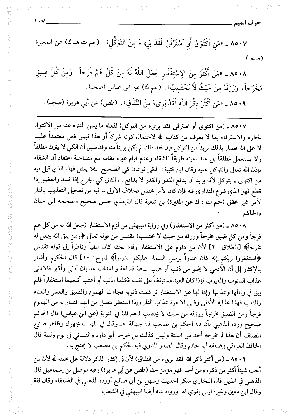 [ ص 83 ] 8509 - (من أكثر ذكر الله فقد برئ من النفاق) لأن في إكثار الذكر دلالة على محبته لله لأن من