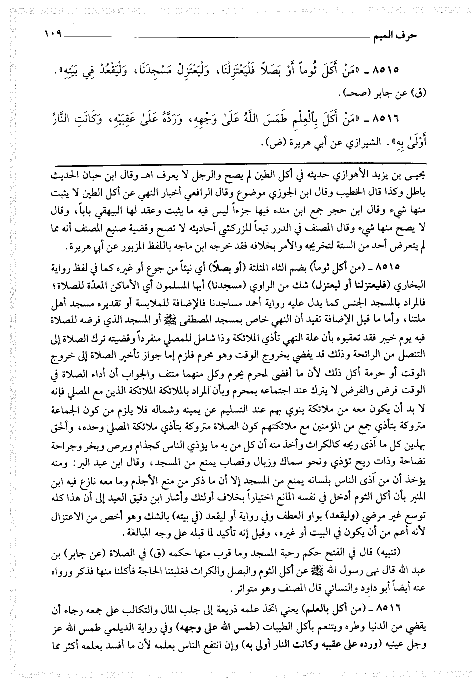 8515 - (من أكل ثوما) بضم الثاء المثلثة (أو بصلا) أي نيئا من جوع أو غيره كما في لفظ رواية البخاري (فليعتزلنا أو ليعتزل) شك من الراوي (مسجدنا) أيها المسلمون أي الأماكن المعدة للصلاة ، فالمراد بالمسجد الجنس كما يدل عليه رواية أحمد مساجدنا فالإضافة للملابسة أو تقديره مسجد أهل ملتنا ، وأما ما قيل الإضافة تفيد أن النهي خاص بمسجد المصطفى صلى الله عليه وسلم أو المسجد الذي فرضه للصلاة فيه يوم خيبر فقد تعقبوه بأن علة النهي تأذي الملائكة وذا شامل للمصلي منفردا وقضيته ترك الصلاة إلى التنصل من الرائحة وذلك قد يفضي بخروج الوقت وهو محرم فلزم إما جواز تأخير الصلاة إلى خروج الوقت أو حرمة أكل ذلك لأن ما أفضى لمحرم يحرم وكل منهما منتف والجواب أن أداء الصلاة في الوقت فرض والفرض لا يترك عند اجتماعه بمحرم وبأن المراد بالملائكة الملائكة الذين مع المصلي فإنه