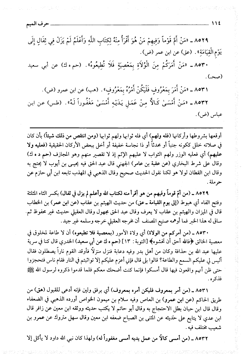 8530 - (من أمركم من الولاة) أي ولاة الأمور (بمعصية فلا تطيعوه) أن لا طاعة لمخلوق في معصية الخالق * (والله أحق أن ترضوه) [ التوبة : 13 ] - (حم ه ك عن أبي سعيد) الخدري ، قال : كنا في سرية عليها عبد الله بن حذافة وكان من أهل بدر وفيه دعابة فنزل منزلا فأوقد القوم نارا يصطلون فقال : أليس لي عليكم السمع والطاعة ؟ قالوا : بلى قال : فإني أعزم عليكم إلا تواثبتم في النار فقام ناس فتحجزوا حتى ظن أنهم واقعون فيها قال : أمسكوا فإنما كنت أضحك معكم فلما قدموا ذكروه لرسول الله صلى الله عليه وسلم فذكره.