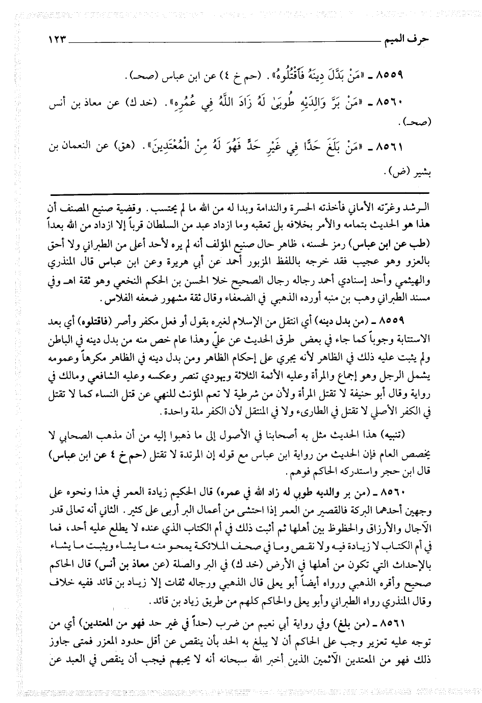 - - - - - - - - - - - - - - - - - - - [ ص 95 ] 8559 - (من بدل دينه) أي انتقل من الإسلام لغيره بقول أو فعل مكفر وأصر (فاقتلوه) أي بعد الاستتابة وجوبا كما جاء في بعض طرق الحديث عن علي ، وهذا عام خص منه من بدل دينه في الباطن ولم يثبت عليه ذلك في الظاهر لأنه يجري على إحكام الظاهر ومن بدل دينه في الظاهر مكرها وعمومه يشمل الرجل وهو إجماع والمرأة وعليه الأئمة الثلاثة ويهودي تنصر وعكسه وعليه الشافعي ومالك في رواية وقال أبو حنيفة : تقتل المرأة ولأن من شرطية لا تعم المؤنث للنهي عن قتل النساء كما لا تقتل في الكفر الأصلي لا تقتل في الطارئ ولا في المنتقل لأن الكفر ملة واحدة.