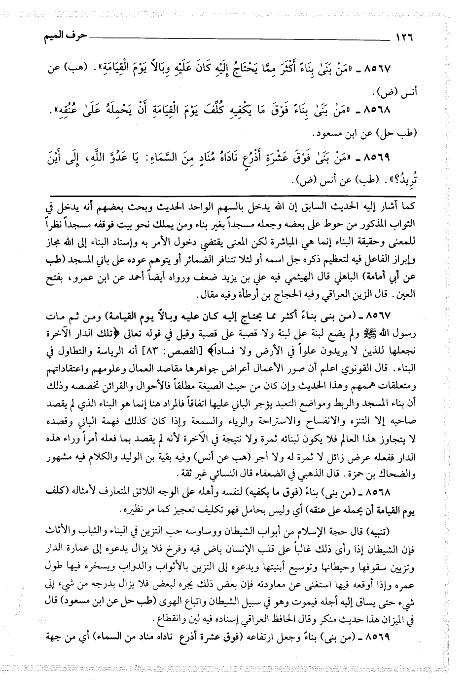 8567 - (من بنى بناء أكثر مما يحتاج إليه كان عليه وبالا يوم القيامة) ومن ثم مات رسول الله صلى الله عليه وسلم ولم يضع لبنة على لبنة ولا قصبة على قصبة وقيل في قوله تعالى * (تلك الدار الآخرة نجعلها للذين لا يريدون علوا في الأرض ولا فسادا) [ القصص : 83 ] أنه الرياسة والتطاول في البناء.