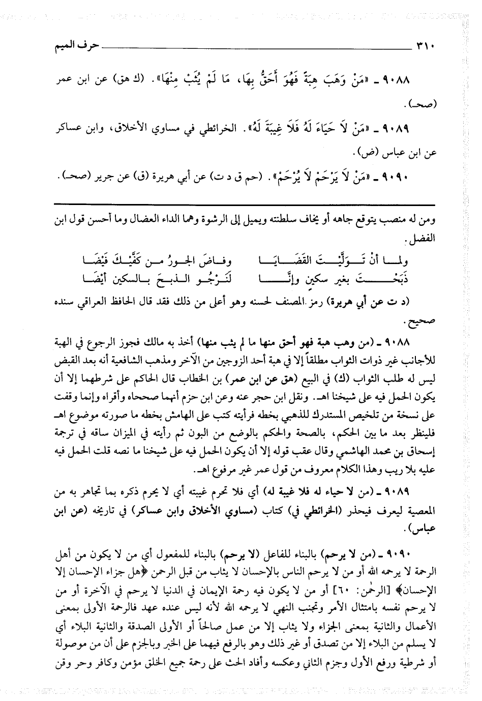 9090 - (من لا يرحم) بالبناء للفاعل (لا يرحم) بالبناء للمفعول أي من لا يكون من أهل الرحمة لا يرحمه الله أو من لا يرحم الناس بالإحسان لا يثاب من قبل الرحمن * (هل جزاء الإحسان إلا الإحسان) * أو من لا يكون فيه رحمة الإيمان في الدنيا لا يرحم في الآخرة أو من لا يرحم نفسه بامتثال الأمر وتجنب النهي لا يرحمه الله لأنه ليس عنده عهد فالرحمة الأولى بمعنى الأعمال والثانية بمعنى الجزاء ولا يثاب إلا من عمل صالحا أو الأولى الصدقة والثانية البلاء أي لا يسلم من البلاء إلا من تصدق أو غير ذلك ، وهو بالرفع فيهما على الخبر وبالجزم على أن من موصولة أو شرطية ورفع الأول وجزم الثاني وعكسه ، وأفاد الحث على رحمة جميع الخلق مؤمن وكافر وحر وقن