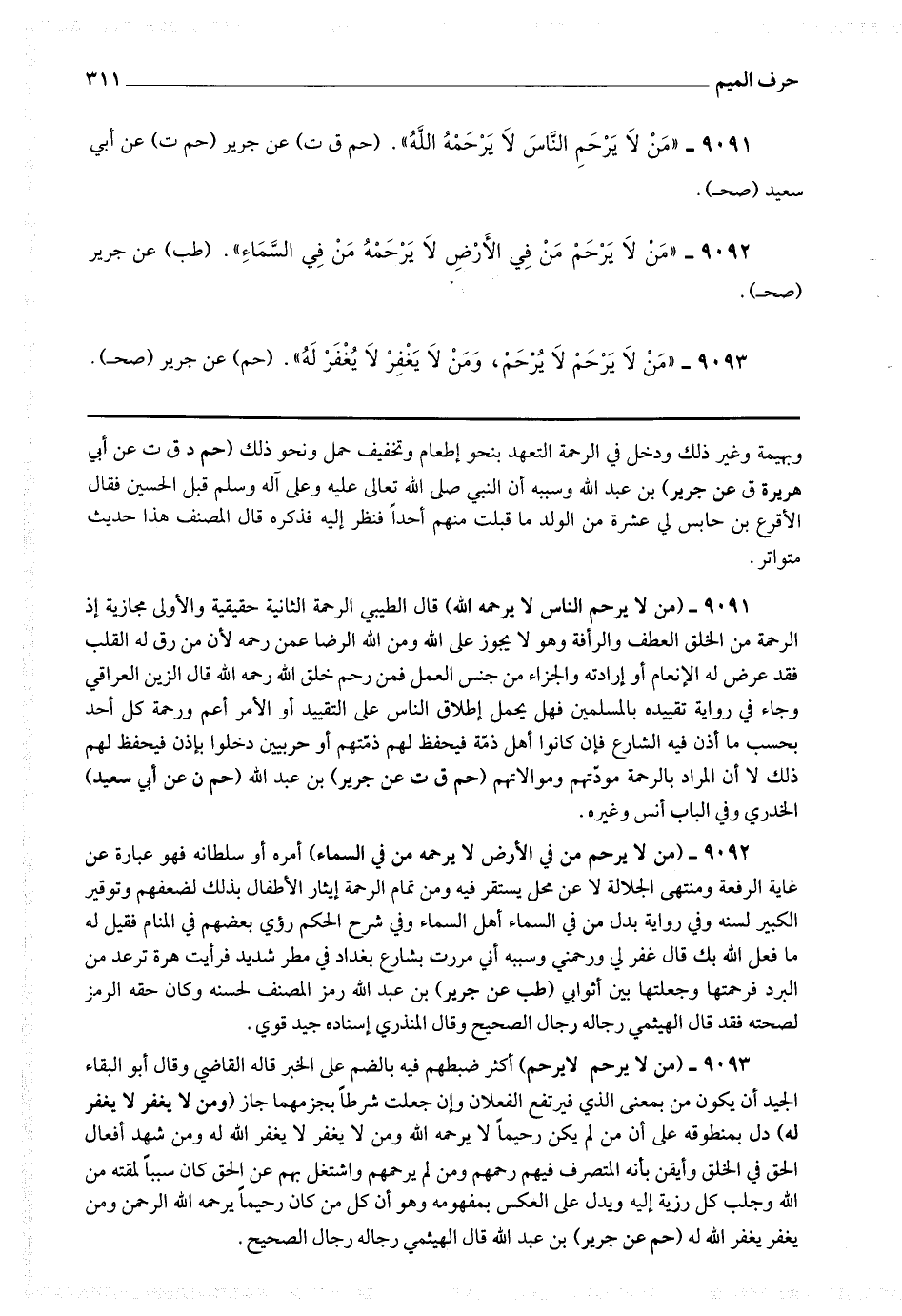 9092 - (من لا يرحم من في الأرض لا يرحمه من في السماء) أمره أو سلطانه فهو عبارة عن غاية الرفعة ومنتهى الجلالة لا عن محل يستقر فيه ومن تمام الرحمة إيثار الأطفال بذلك لضعفهم وتوقير الكبير لسنه وفي رواية بدل من في السماء أهل السماء وفي شرح الحكم رؤي بعضهم في المنام فقيل له : ما فعل الله بك قال : غفر لي ورحمني ، وسببه أني مررت بشارع بغداد في مطر شديد فرأيت هرة ترعد من البرد فرحمتها وجعلتها بين أثوابي (طب) عن [ ص 240 ] جرير بن عبد الله رمز المصنف لحسنه وكان حقه الرمز لصحته فقد قال الهيثمي : رجاله رجال الصحيح وقال المنذري : إسناده جيد قوي.