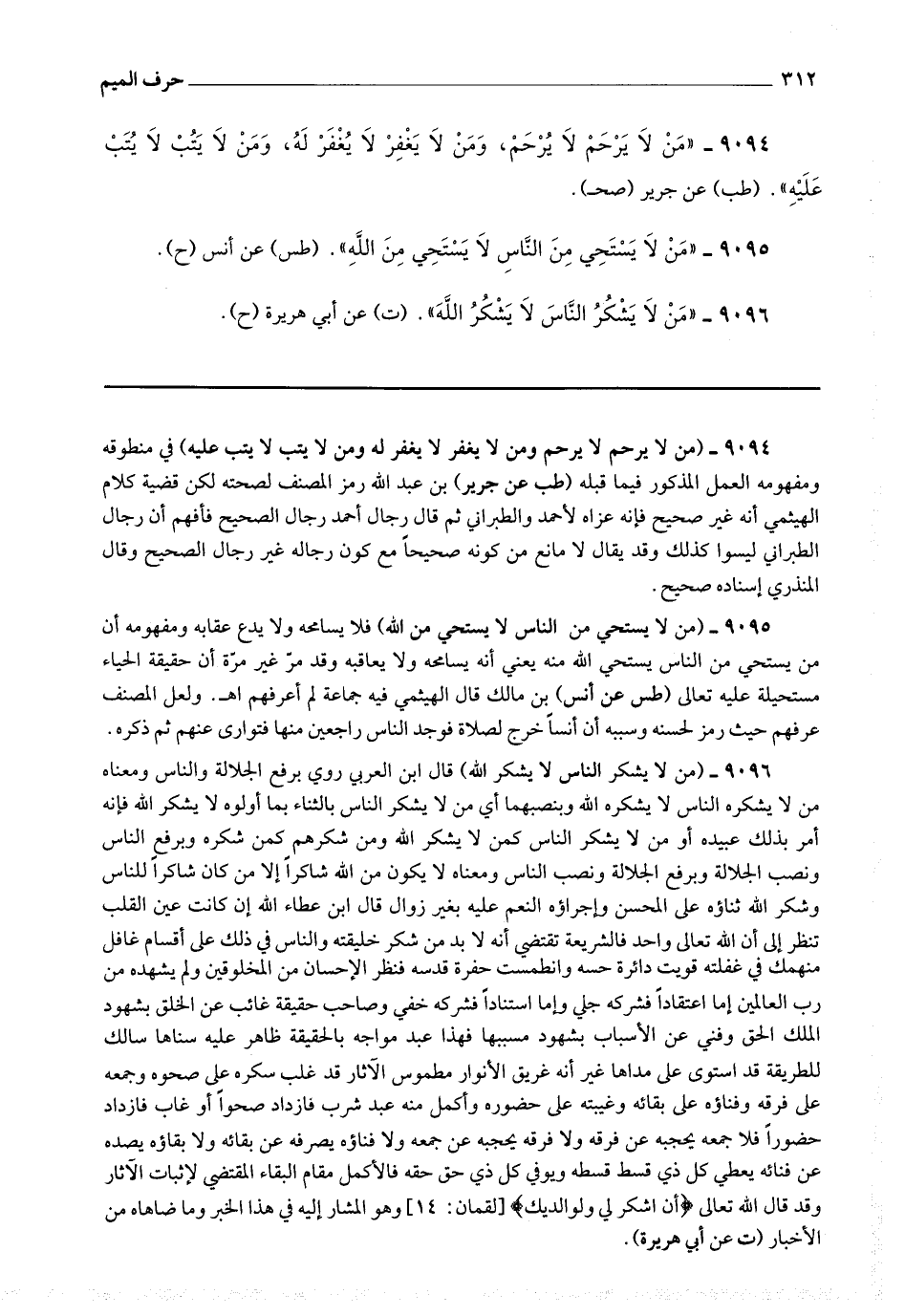 9096 - (من لا يشكر الناس لا يشكر الله) قال ابن العربي : روي برفع الجلالة والناس ومعناه من لا يشكره الناس لا يشكره الله وبنصبهما أي من لا يشكر الناس بالثناء بما أولوه لا يشكر الله فإنه أمر بذلك عبيده أو من لا يشكر الناس كمن لا يشكر الله ومن شكرهم كمن شكره وبرفع الناس ونصب الجلالة وبرفع الجلالة ونصب الناس ومعناه لا يكون من الله شاكرا إلا من كان شاكرا للناس وشكر الله ثناؤه على المحسن وإجراؤه النعم عليه بغير زوال قال ابن عطاء الله : إن كانت عين القلب تنظر إلى أن الله تعالى واحد فالشريعة تقتضي أنه لا بد من شكر خليقته والناس في ذلك على أقسام غافل منهمك في غفلته قويت دائرة حسه وانطمست حفرة قدسه فنظر الإحسان من المخلوقين ولم يشهده من رب العالمين إما اعتقادا فشركه جلي وإما استنادا فشركه خفي وصاحب حقيقة غائب عن الخلق بشهود الملك الحق وفني عن الأسباب بشهود مسببها فهذا عبد مواجه بالحقيقة ظاهر عليه سناها سالك للطريقة قد استوى على مداها غير أنه غريق الأنوار مطموس الآثار قد غلب سكره على صحوه وجمعه على فرقه وفناؤه على بقائه وغيبته على حضوره وأكمل منه عبد شرب فازداد صحوا أو غاب فازداد حضورا فلا جمعه يحجبه عن فرقه ولا فرقه يحجبه عن جمعه ولا فناؤه يصرفه عن بقائه ولا بقاؤه يصده عن فنائه يعطي كل ذي قسط قسطه ويوفي كل ذي حق حقه فالأكمل مقام البقاء المقتضي لإثبات الآثار وقد قال الله تعالى * (أن اشكر لي ولوالديك) * وهو المشار إليه في هذا الخبر وما ضاهاه من الأخبار.