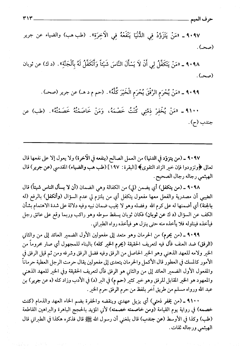 9099 - (من يحرم) من الحرمان وهو متعد إلى مفعولين الأول الضمير العائد إلى من والثاني (الرفق) ضد العنف فأل فيه لتعريف الحقيقة (يحرم الخير كله) بالبناء للمجهول أي صار محروما من الخير ولامه للعهد الذهني وهو الخير الحاصل من الرفق وفيه فضل الرفق وشرفه ، ومن ثم قيل الرفق في الأمور كالمسك في العطور ، قال الأكمل : والحرمان يتعدى إلى مفعولين يقال حرمت الرجل العطية حرمانا والمفعول الأول الضمير العائد إلى من والثاني هو الرفق فأل لتعريف الحقيقة وفي الخير للعهد الذهني والمعهود هو الخير المقابل للرفق وهو خير كثير (حم م) في البر (د) في الأدب وزاد كله (هو عن جرير) بن عبد الله ورواه مسلم من طريق آخر بلفظ من حرم الرفق حرم الخير.